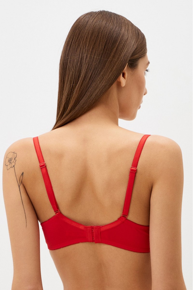Бюстгальтер женский из кружева и микрофибры с мягкой чашкой на каркасе. По чашке проходят два вертикальных шва. По верху чашки ажурное неэластичное полотно. По бокам присутствуют пластины для усиления поддержки. Отлично приподнимает грудь. У больших размеров сделаны широкие бретели, которые обеспечивают удобную и надежную поддержку.
