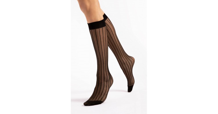 Тонкие гольфы на 15 ден с тонкими полосками. Широкая и удобная гладкая резинка. Их можно сочетать во многих классических образах. Хорошо сочетается со "школьными" нарядами.