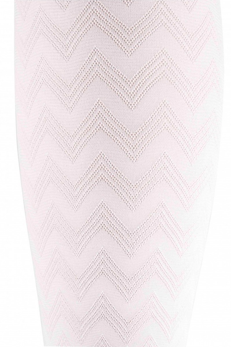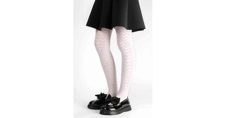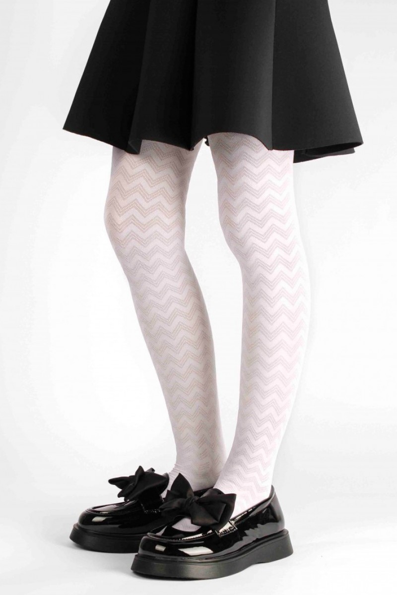 Эластичные колготы плотностью 60 ден для детей и подростков в школу, на танцы или под праздничное платье в классическом белом цвете. Мягкие, матовые детские колготки с геометрическим рисунком "ЗигЗаг" до линии шортиков. Имеют усиление в области торса, комфортные швы и уплотненный мысок, которые обеспечат комфорт в течение всего дня.
