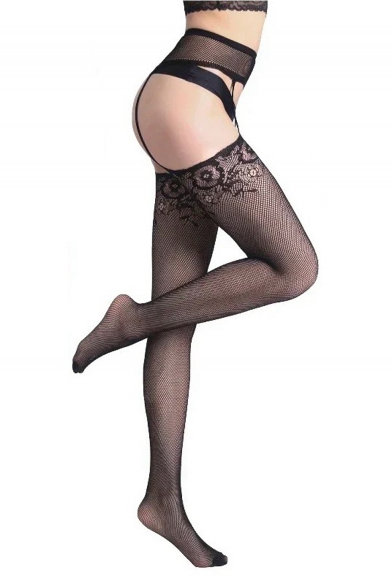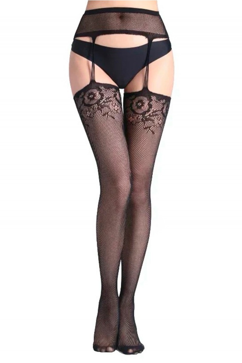 Фантазийные колготки в сеточку с изысканной имитацией чулков станут ярким акцентом любого образа. Верхняя часть украшена нежными цветочными рисунками, которые добавляют женственности и утончённости. Контраст фактур создаёт эффект стильного многослойного сочетания. Эластичный материал обеспечивает комфортную посадку и подчёркивает линии ног. Идеальный выбор для особых случаев и модных образов.