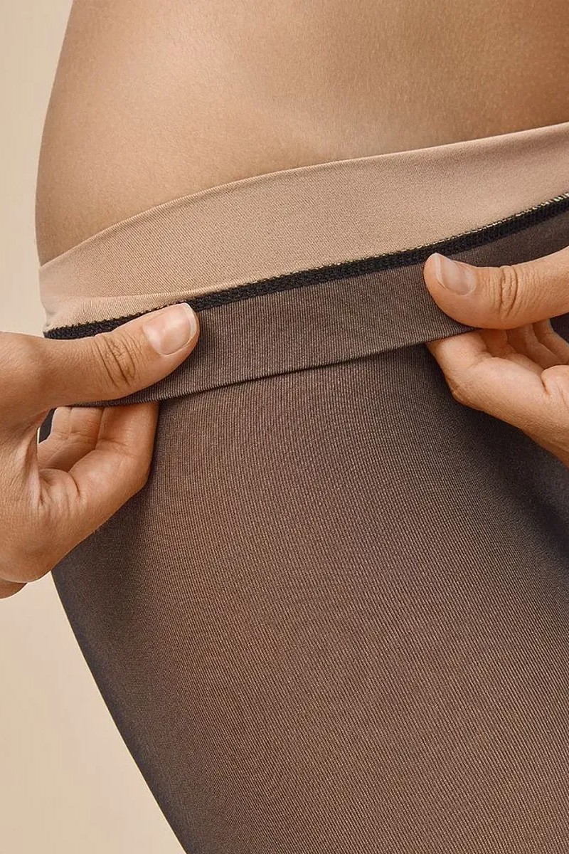Эластичные плотные колготки. Изготовленные по двухслойной технологии. Наружный слой - полупрозрачный (черного цвета), выполнен из гладкого эластичного полиамида (с эффектом прозрачности колготок), внутренний слой более плотный (телесного цвета), выполнен из мягкого приятного микроволокна (полиэстер). Для сезона ношения осень - зима. Создают оригинальный элегантный вид полупрозрачных колготок, сочетая его с комфортным терморегулирующим эффектом (позволяют коже дышать, помогают согревать и сохранять тепло). Колготки с классической посадкой (на талии). С двухслойной структурой. Однородные по всей длине. С мягким комфортным широким поясом-резинкой, шириной - 3.0 см. С ластовицей. С комфортным плоским соединительным швом. Не формованные.
