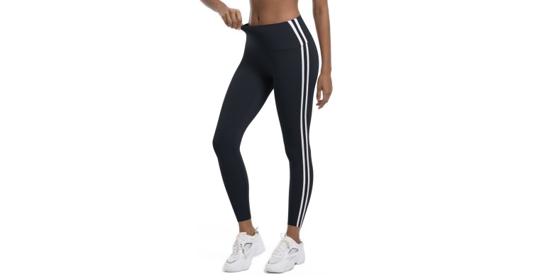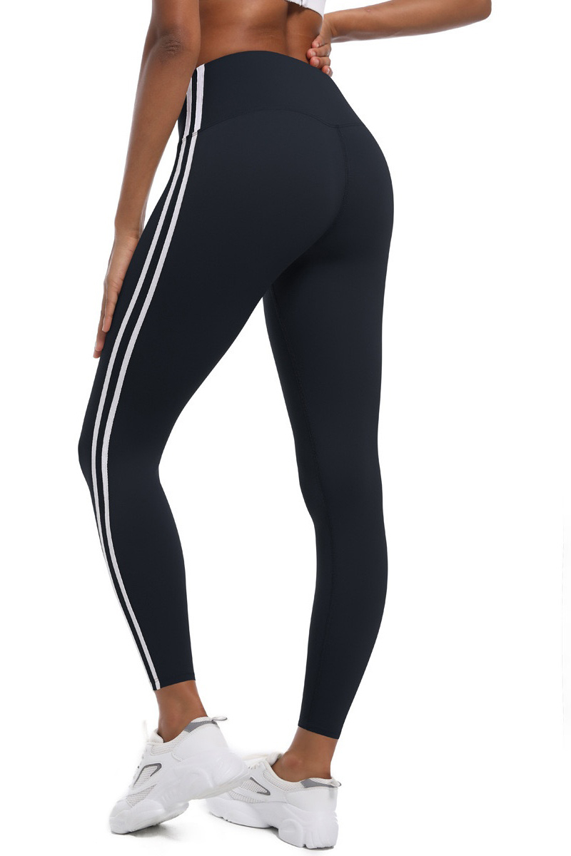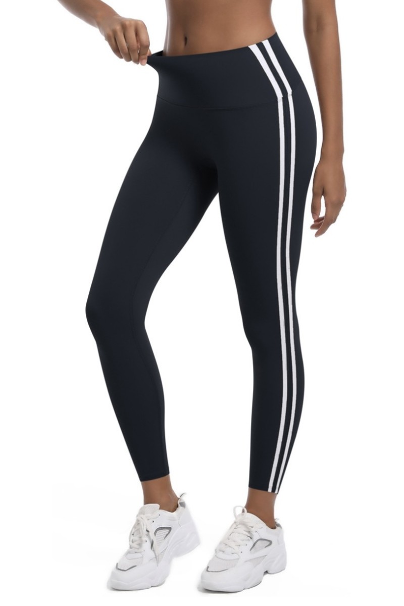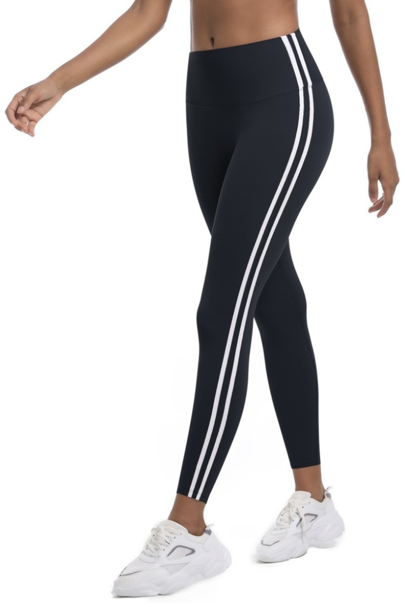 Эластичные леггинсы из мягкой матовой микрофибры с высокой посадкой и широким поддерживающим поясом. Две контрастные белые полосы вдоль боковых швов визуально вытягивают силуэт и добавляют спортивный акцент. Плотно облегают, не сковывают движения, удобные для тренировок и повседневных образов. Подходят для девушек невысокого роста.