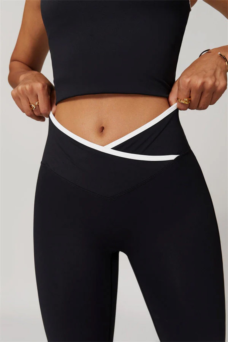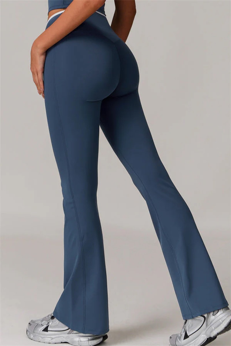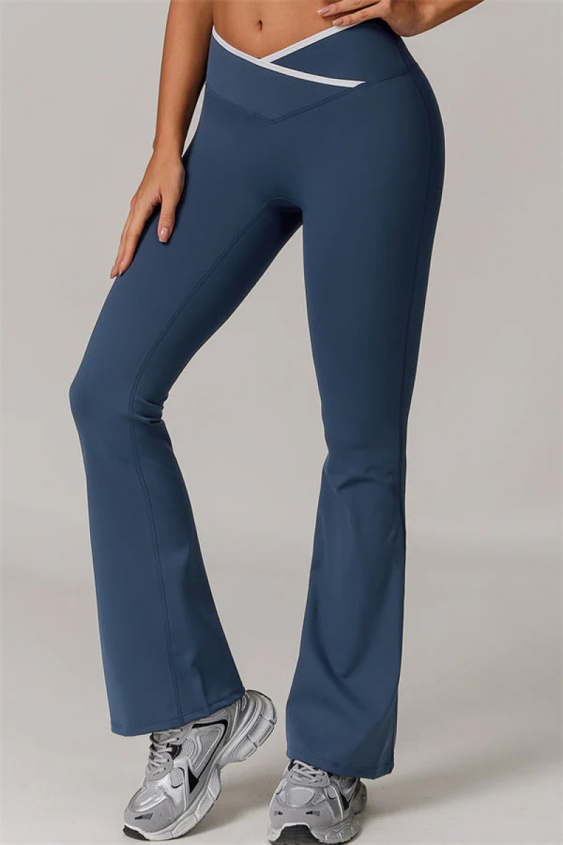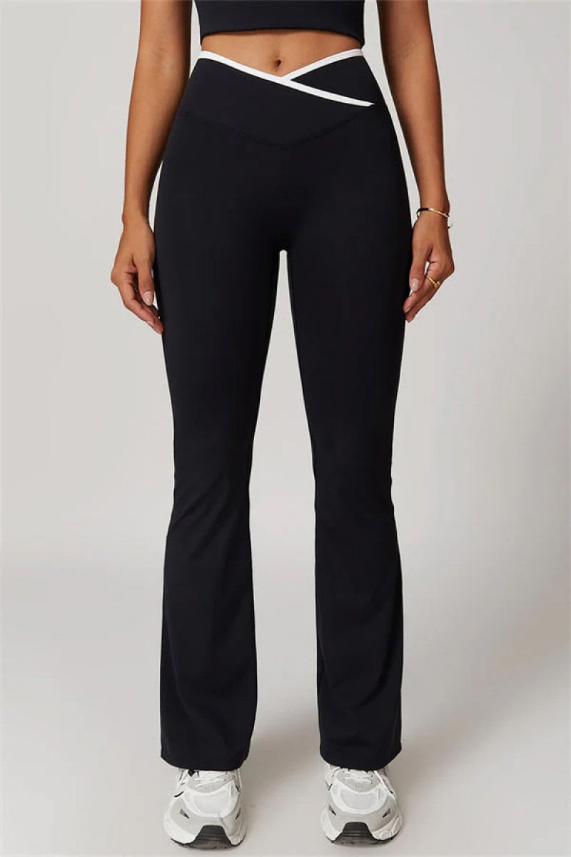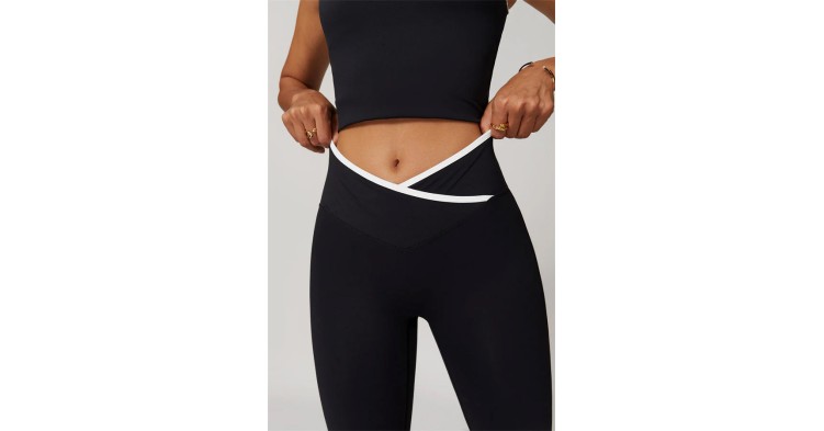 Удобные эластичные брюки с мягкой посадкой и расклёшенным от колена силуэтом. Фирменный акцент — перекрёстный V‑образный пояс с контрастной белой лентой спереди, визуально подчеркивающий талию. Матовая ткань плотно облегает без просвета, хорошо тянется и держит форму. Подходят для йоги, танцев, прогулок и casual‑образов с кроссовками.