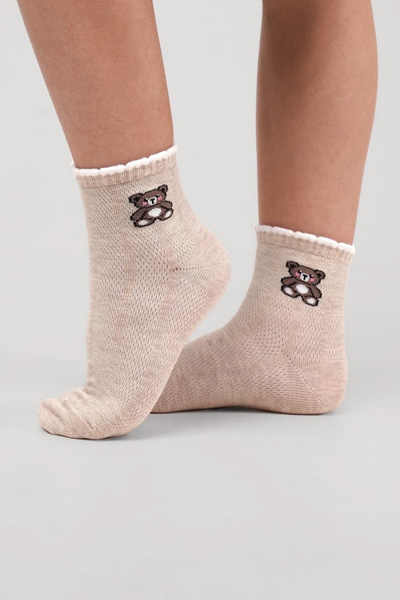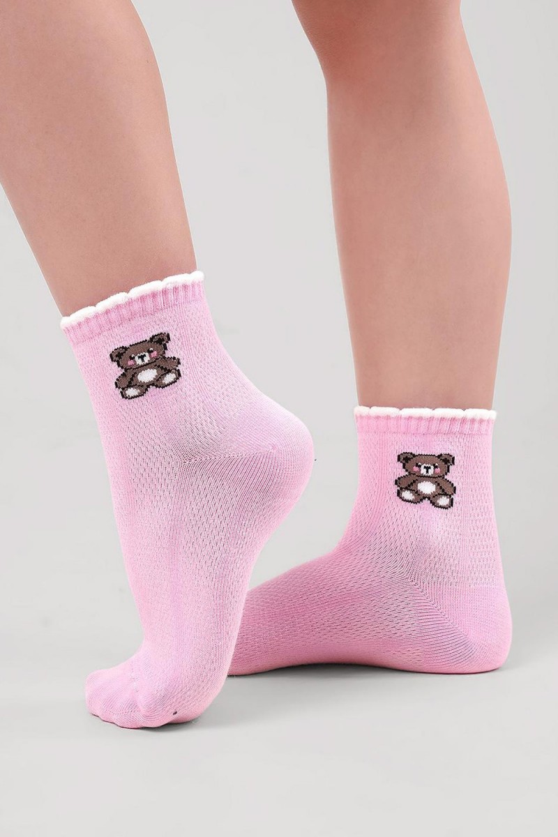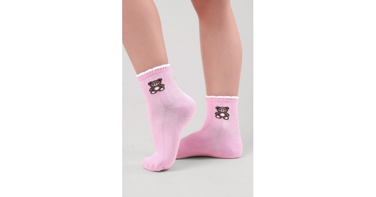 Облегчённые носки для девочки с сетчатым плетением и милым рисунком мишки на паголенке. Мягкая и дышащая структура обеспечивает отличную вентиляцию, а эластичная резинка мягко фиксирует носочки на ножке, не вызывая дискомфорта. Очаровательный медвежонок добавляет игривости и неповторимого стиля повседневному образу. Прекрасный выбор для тёплой погоды и активных прогулок!