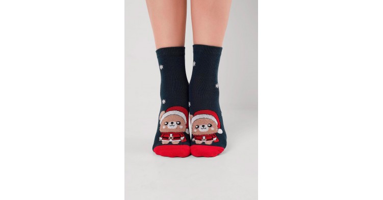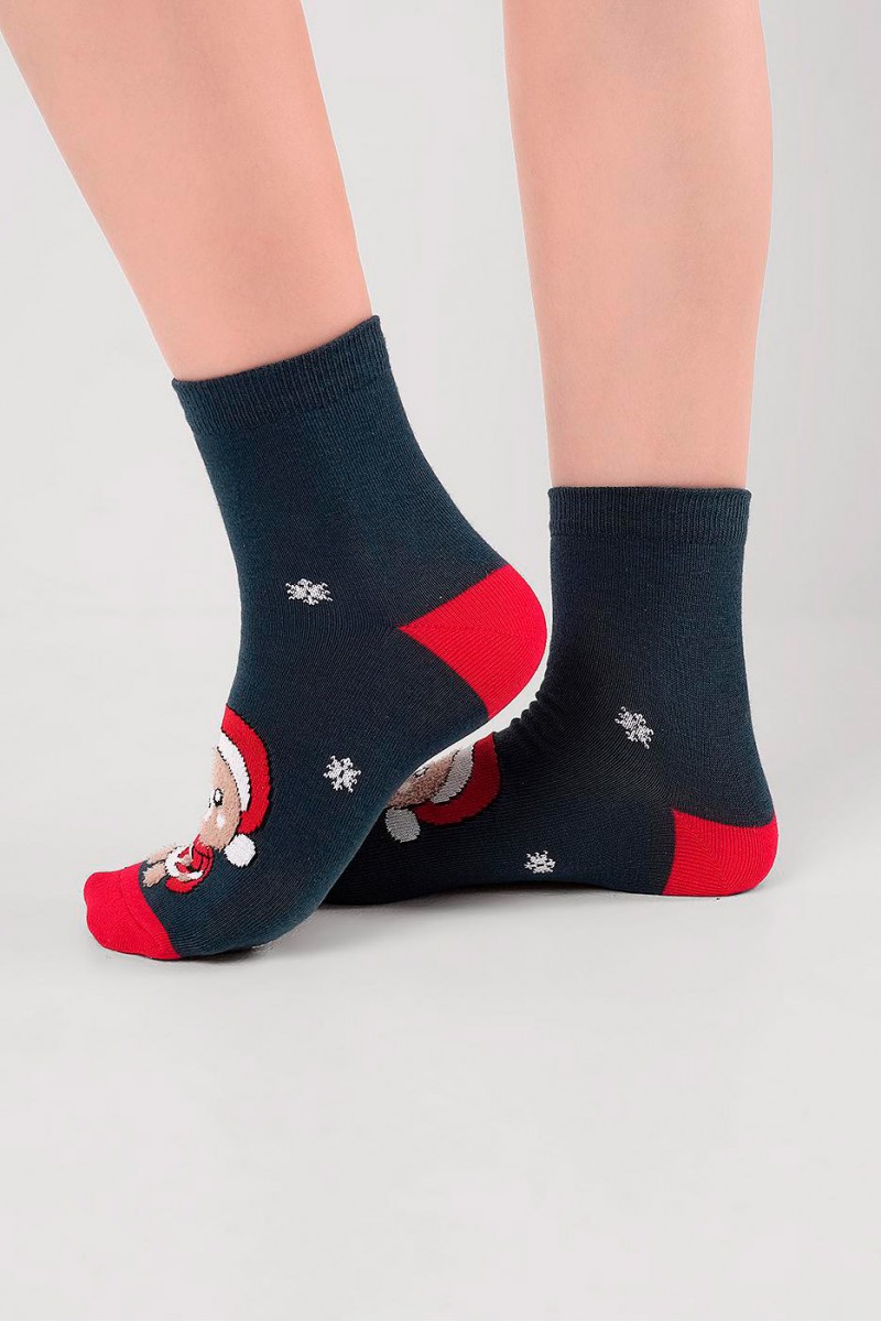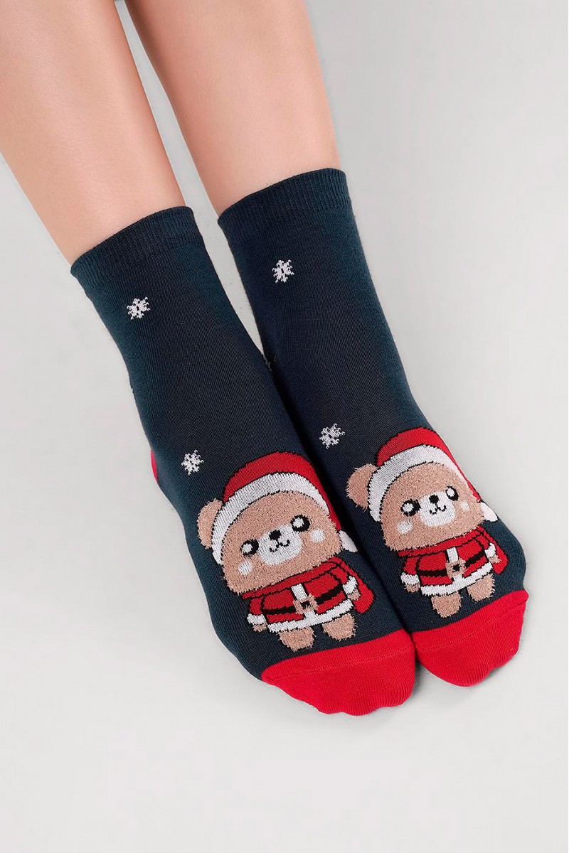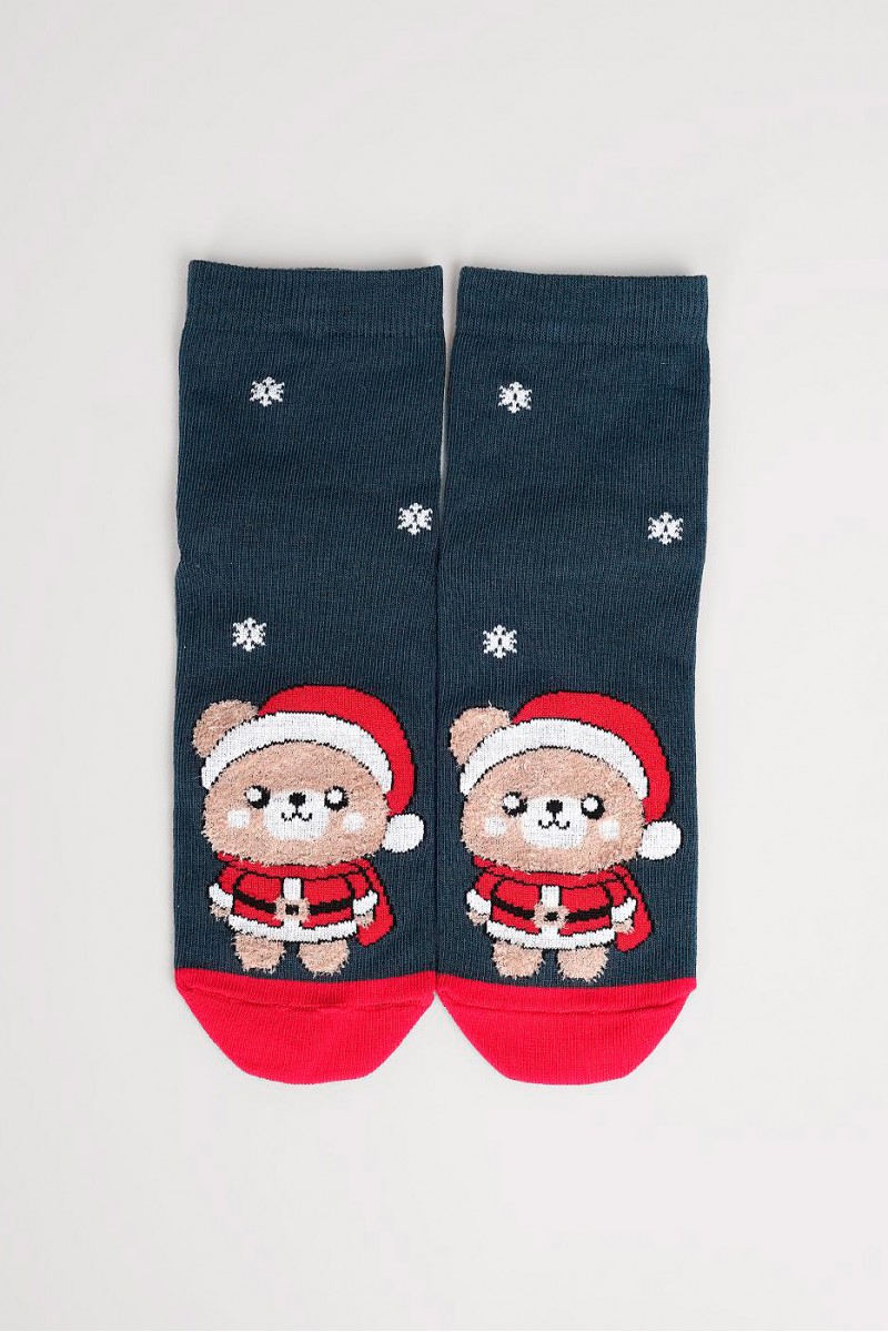 Детские носки с выделенным мысом и пяткой обеспечивают удобство и комфорт при носке. Украшены милым рисунком медведя в новогоднем костюме, создающим праздничное настроение. Тело медведя выполнено из мягкой пряжи «травка», что делает дизайн объёмным и приятным на ощупь. Отличный вариант для зимних дней и новогодних подарков.