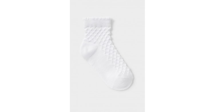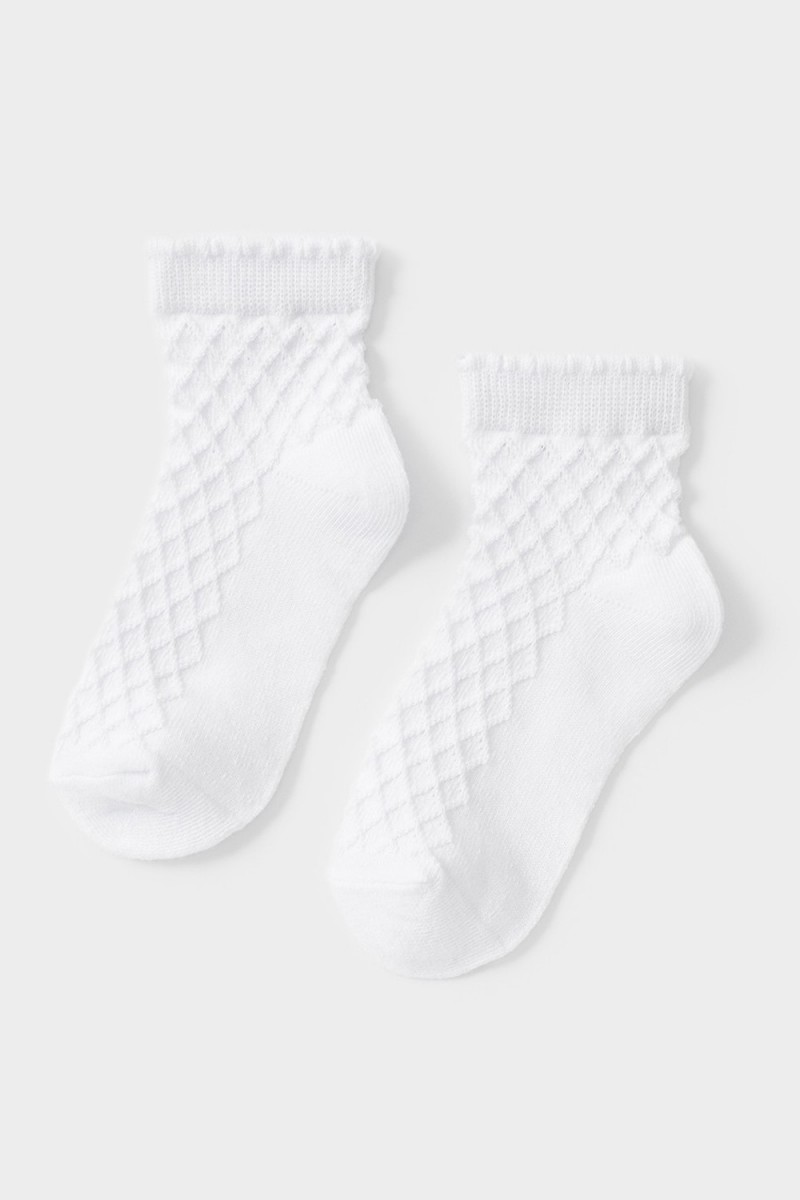 Носки короткие для девочки с формованной пяткой и эластичной резинкой по краю. Связаны ажурным узором, подойдут как для утренника, или как повседневный аксессуар.