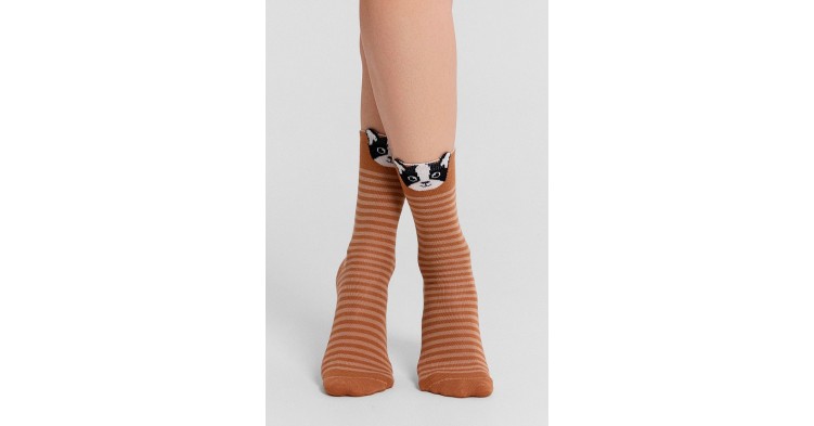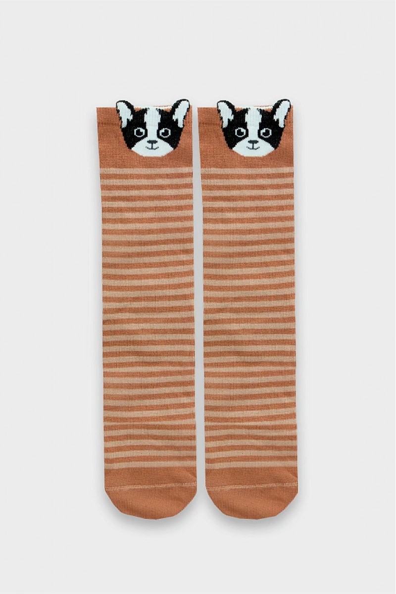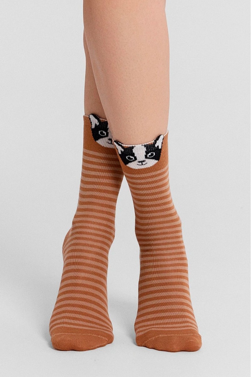 Детские носки в полоску из хлопка с оригинальной мордочкой котика и объёмными ушками на резинке — яркий и удобный аксессуар для повседневной носки. Мягкая резинка не сдавливает ножку, обеспечивая комфорт в течение дня. Вывязанная пятка гарантирует отличную посадку и не скатывание носков. Идеальны для активных малышей, добавляя весёлый акцент в их образ.