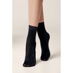 Плотные сияющие носки с люрексом смотрятся так стильно и оригинально, что вам не захочется прятать их под одеждой. Плотность модели 50 ден, металлизированная нить люрекса создана для сияющих образов. Эластичные, обеспечивают идеальное облегание.
