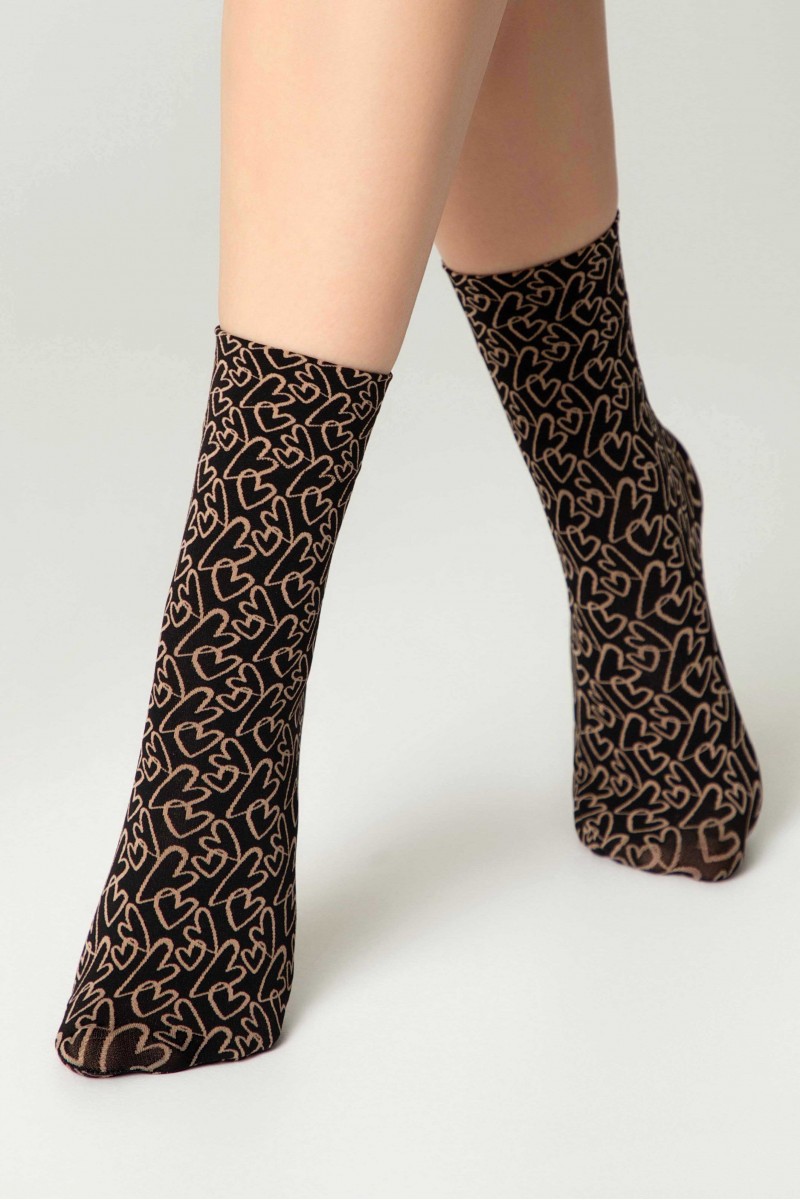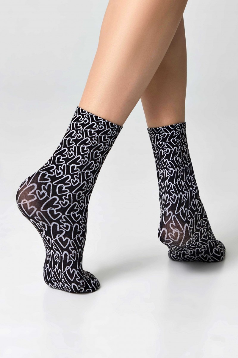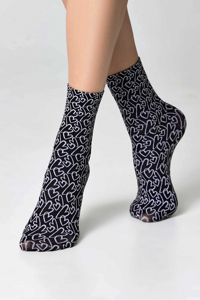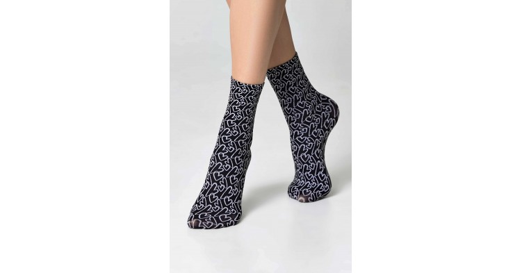 Женские носки средней длины с оригинальным контрастным рисунком, состоящим из стильных сердечек. Изготовленные из мягкой микрофибры плотностью 70 ден. Приятный материал подарит комфорт в течении всего дня. Оригинальный принт поможет подчеркнуть вашу индивидуальность.