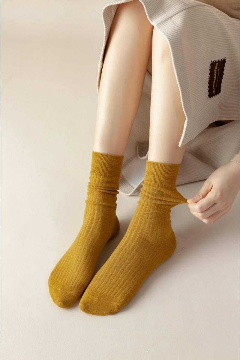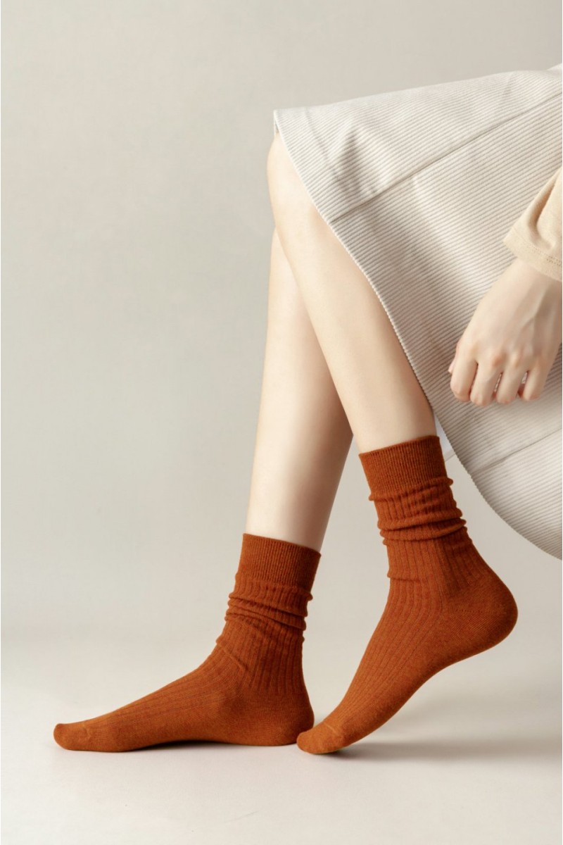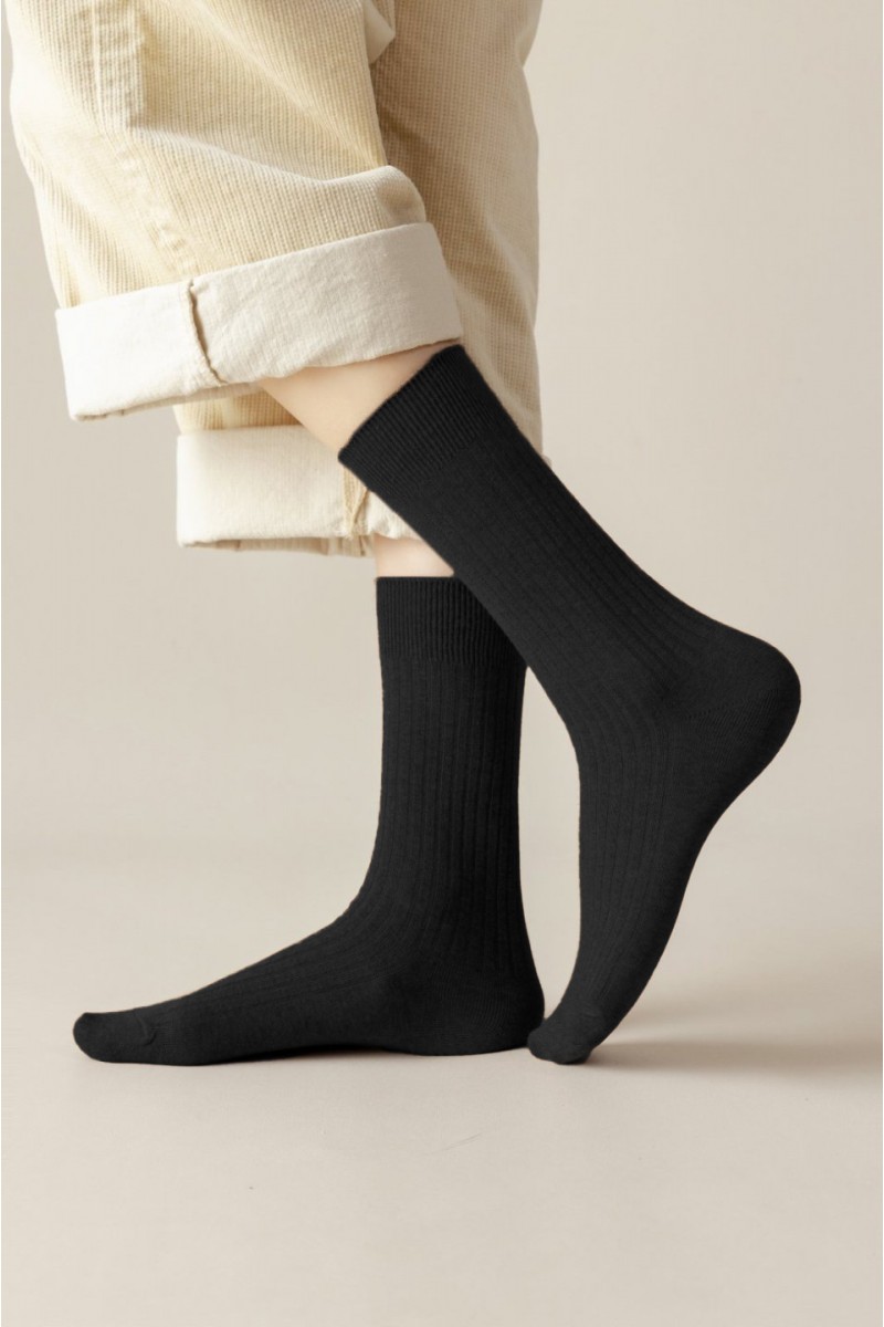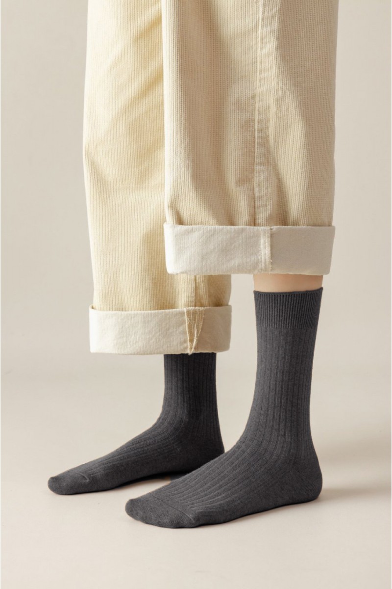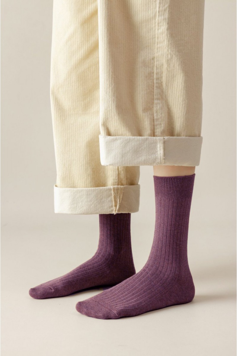 Высокие женские демисезонные носки из плотного хлопка. Рельефный узор в полоску на паголенке и верхней части стопы. Сверху широкая гладкая резинка. Пяточка вывязанная, на мыске аккуратный шов. Носки мягкие, благодаря эластану в составе прочные и износостойкие. Представлены в 10 оттенках: яркий фиолетовый, кирпичный, горчичный, классические черный, белый, бежевый, серый.