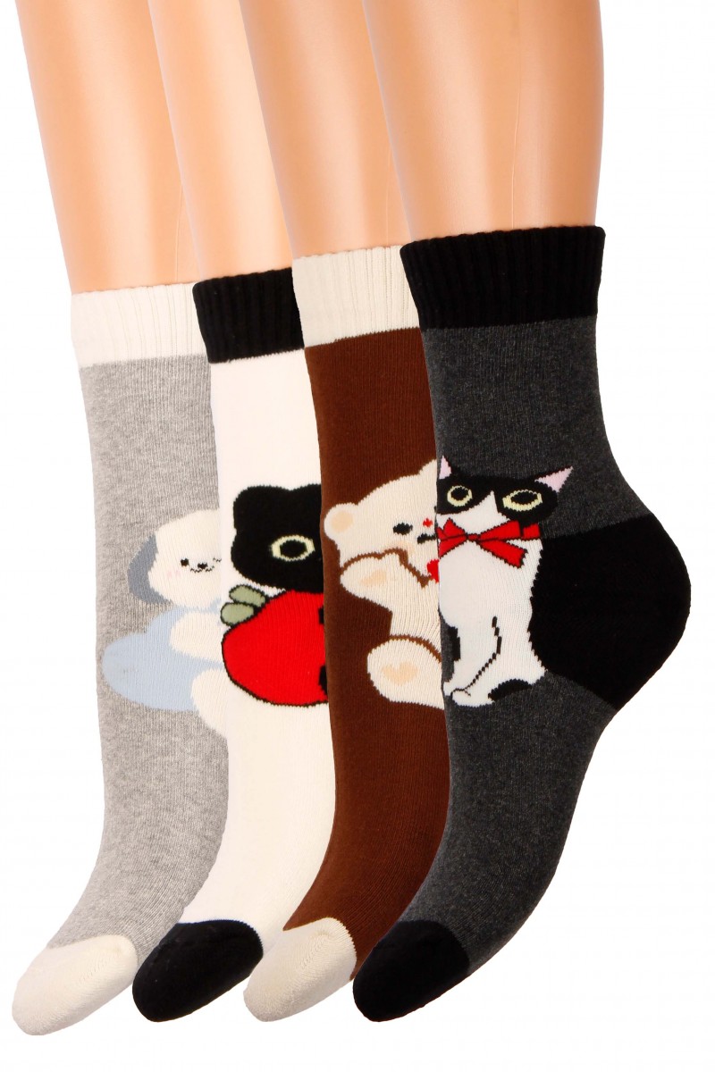 Яркие высокие носки с забавными рисунками милых животных сбоку пятки — отличный способ добавить настроения в повседневный образ. Детализированные иллюстрации привлекают внимание и создают игривое настроение. Удобная вывязанная пятка и укреплённый мысок обеспечивают комфорт при носке и повышенную износостойкость. Подходят для дома, прогулок и в качестве необычного подарка.