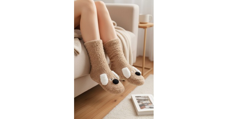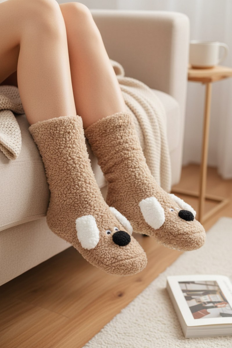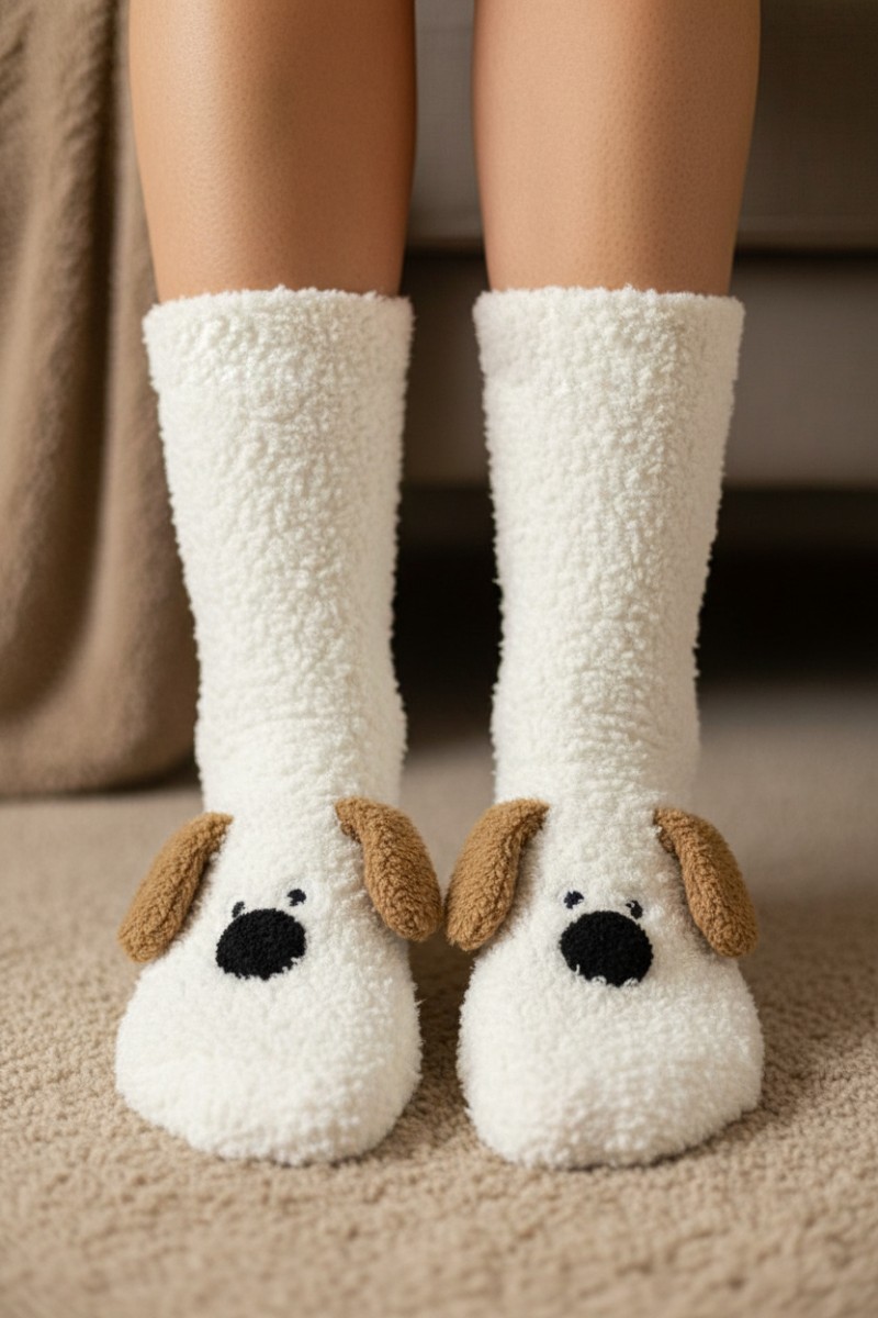 Тёплые высокие носки с милыми мордочками собачек и забавными свисающими ушками станут уютным дополнением к домашнему образу. Мягкий, приятный на ощупь материал обеспечивает комфорт в течение всего дня. Силиконовые кружочки на стопе предотвращают скольжение, делая носки безопасными и удобными. Идеальный выбор для тех, кто любит сочетание уюта и очаровательного дизайна.