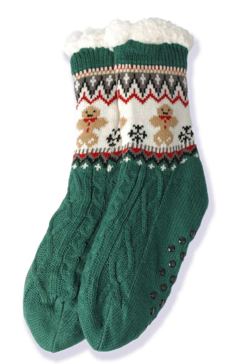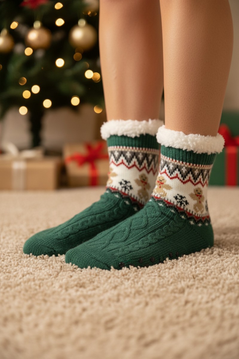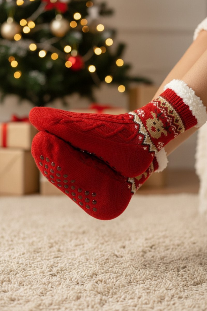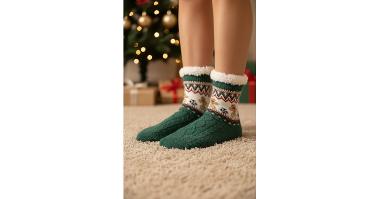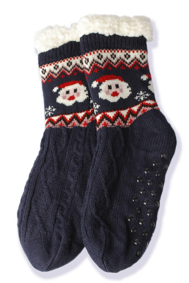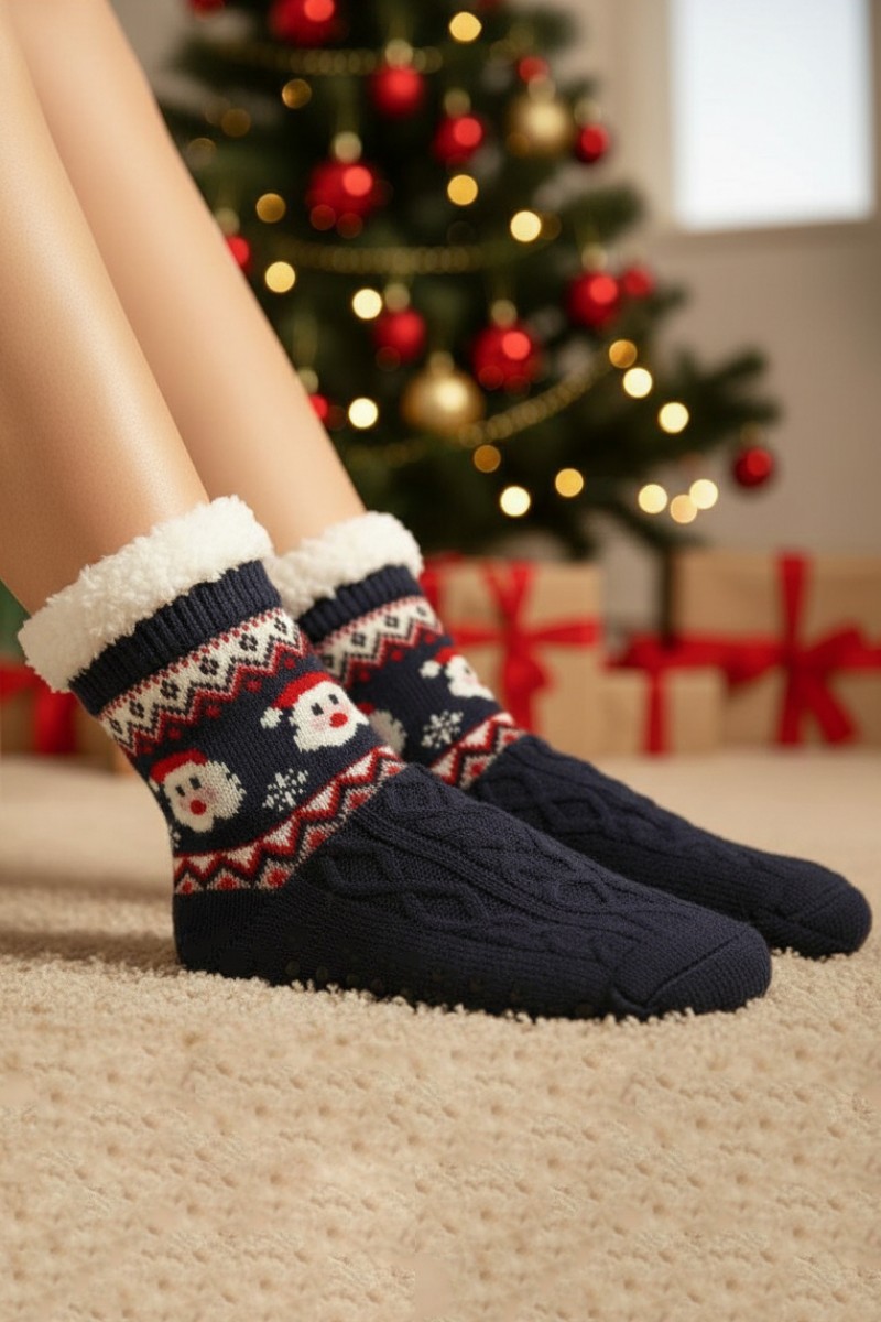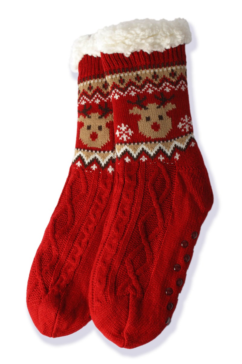 Объемные теплые носки из акрила с искуственным мехом внутри с новогодними рисунками. Пяточка вывязанная, на стопе силиконовые капельки от скольжения. Модель отлично подойдёт для дома как альтернатива тёплым тапочкам. Носочки станут отличным новогодним подарком, дополнят ваш образ на семейной фотосессии.