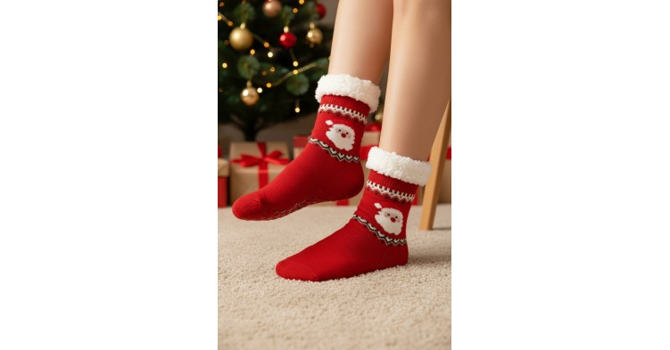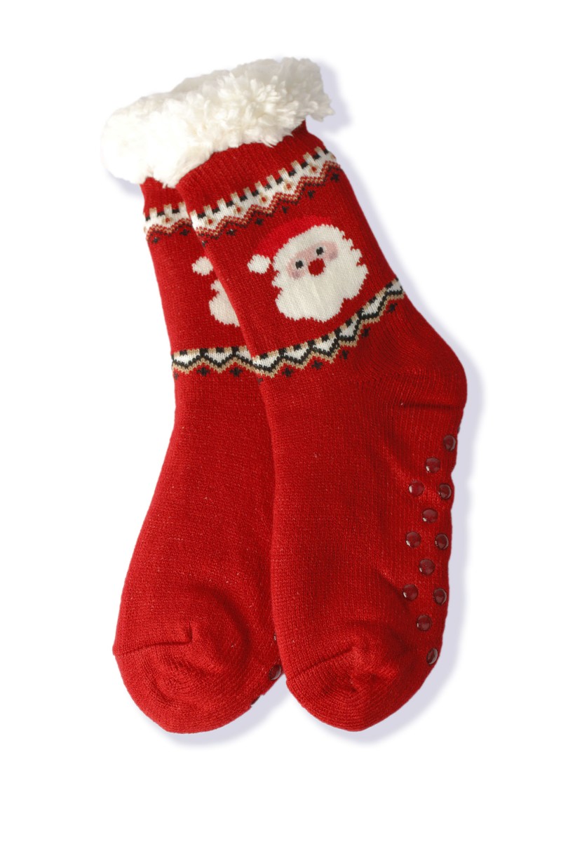 Объемные теплые носки из акрила с искуственным мехом внутри с новогодними рисунками. Пяточка вывязанная, на стопе силиконовые капельки от скольжения. Модель отлично подойдёт для дома как альтернатива тёплым тапочкам. Носочки станут отличным новогодним подарком, дополнят ваш образ на семейной фотосессии.