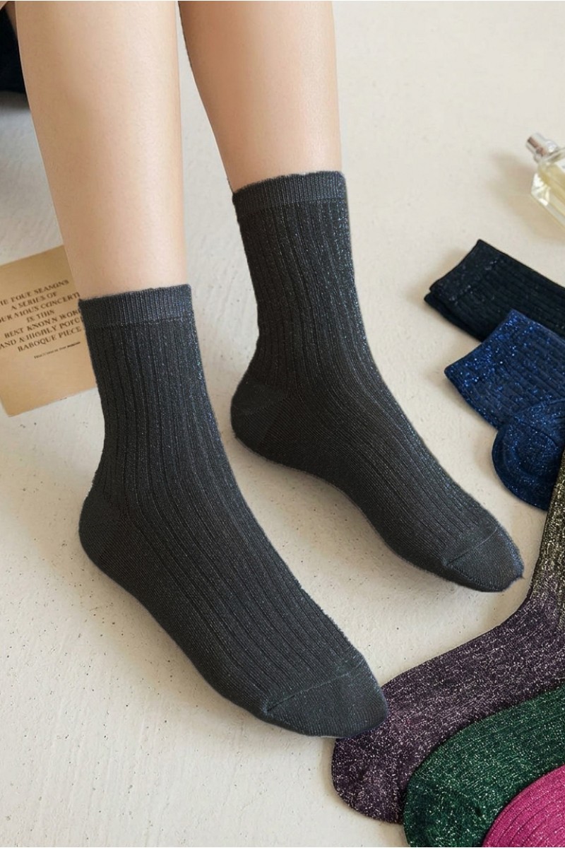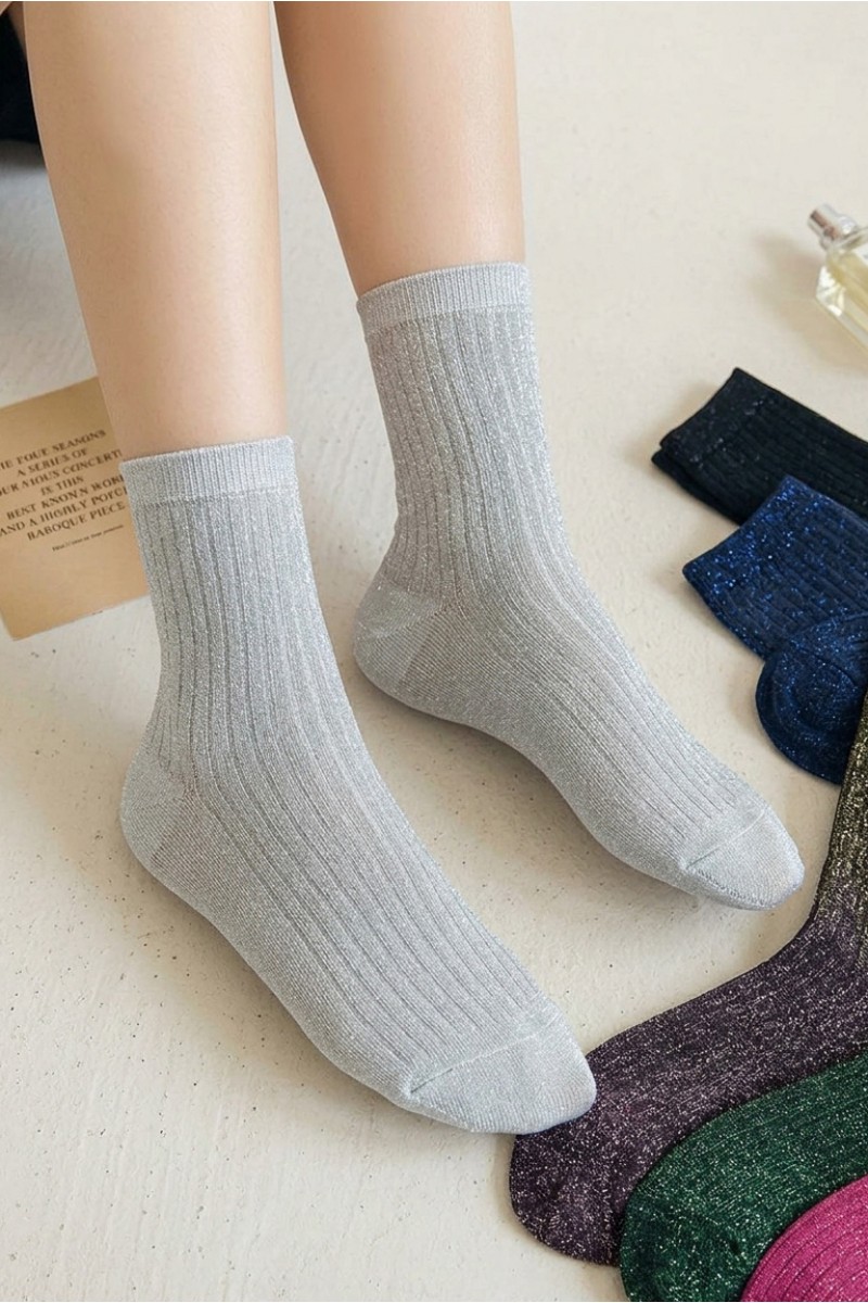 Стильные женские носки с люрексом для создания праздничных и повседневных образов! Носки средней длины, выполнены из приятного к телу материала с добавлением люрекса, который придаёт изделиям красивый блеск и элегантный вид. В наборе представлены классические модные оттенки: черный и серебристый — для любого образа. Эластичная резинка надежно удерживает носки, не сдавливая ногу.