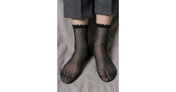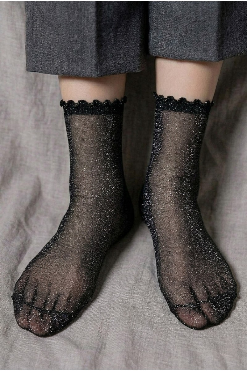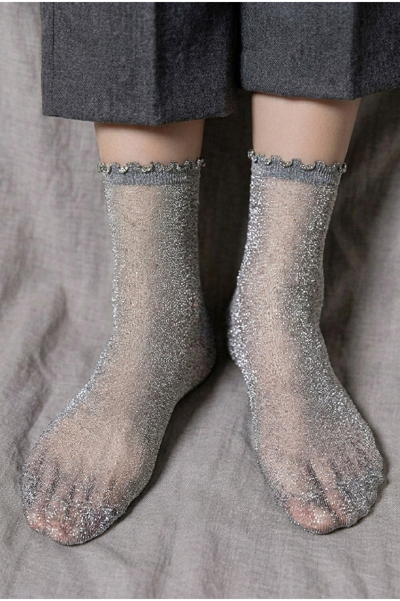 Эти стильные женские носки станут изюминкой любого образа! Модель выполнена из тонкой эластичной ткани с добавлением люрекса, что придает носкам нежное мерцание и легкий блестящий эффект. Смотрится нежно и утончённо, а мягкая окантовка с аккуратной оборкой по верху дополняет изысканный образ. Такие носки прекрасно подойдут как для повседневной носки, так и для особых случаев.