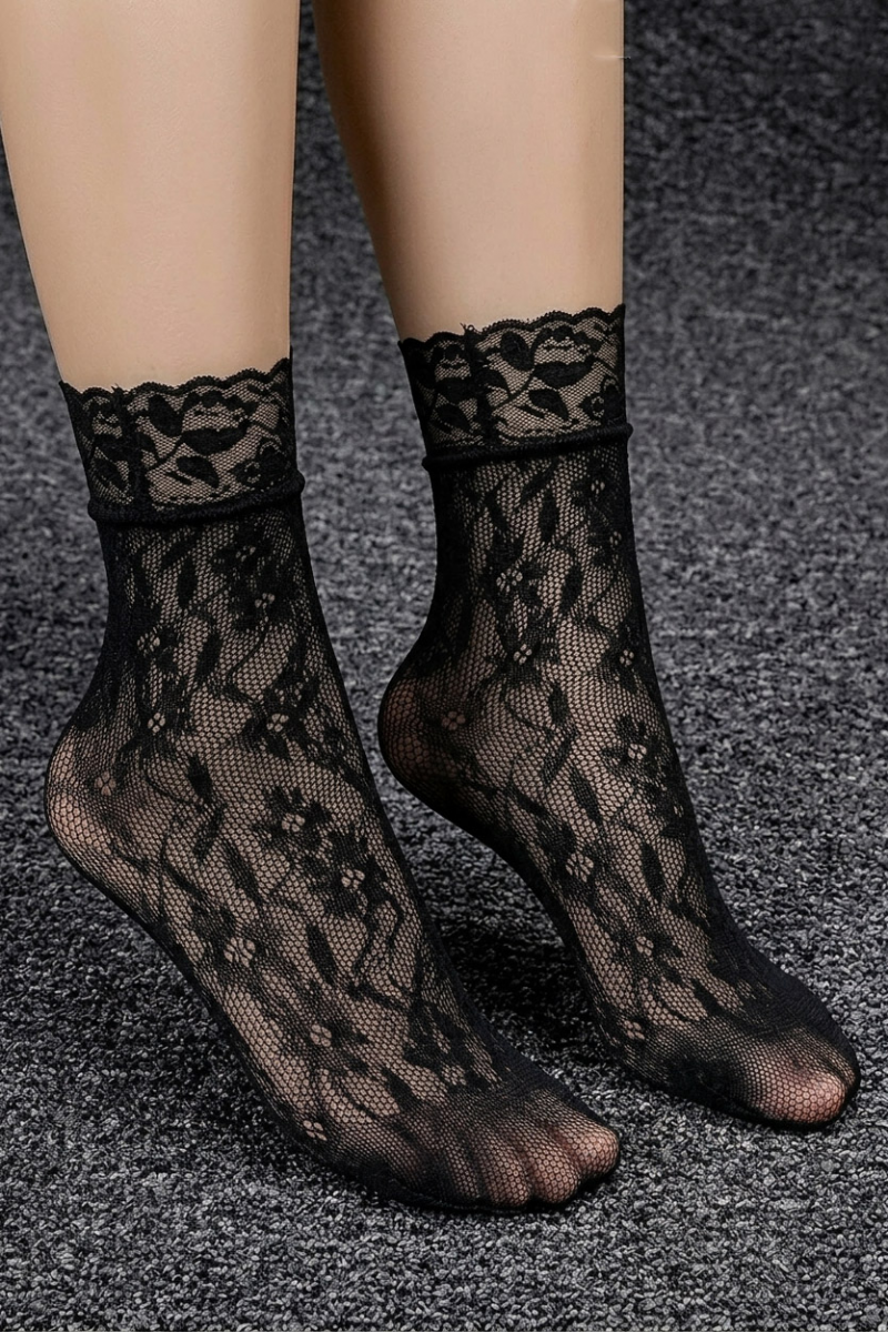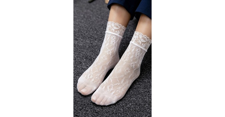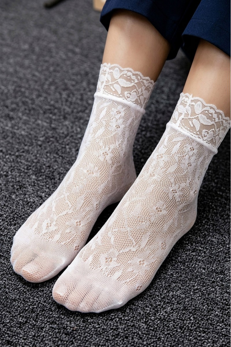 Нежные полупрозрачные носочки выше щиколотки с цветочным кружевом и фигурным краем. Лёгкие, эластичные и дышащие — добавляют романтичный акцент и комфортны на каждый день и для особых случаев. Совет по стилю: Носите с платьями, юбками и укороченными брюками — кружево подчёркивает щиколотку и придаёт образу лёгкость. Отличный выбор для повседневных и праздничных сетов, в том числе для свадебных образов.