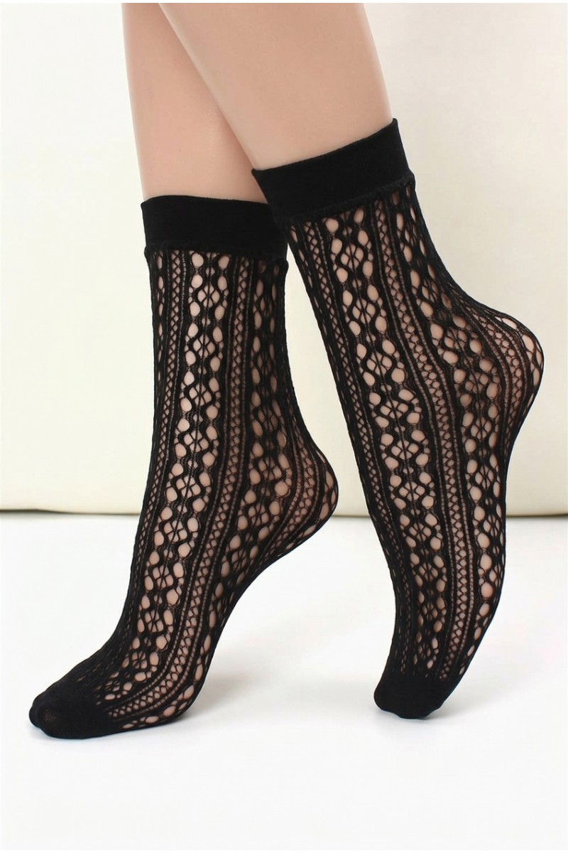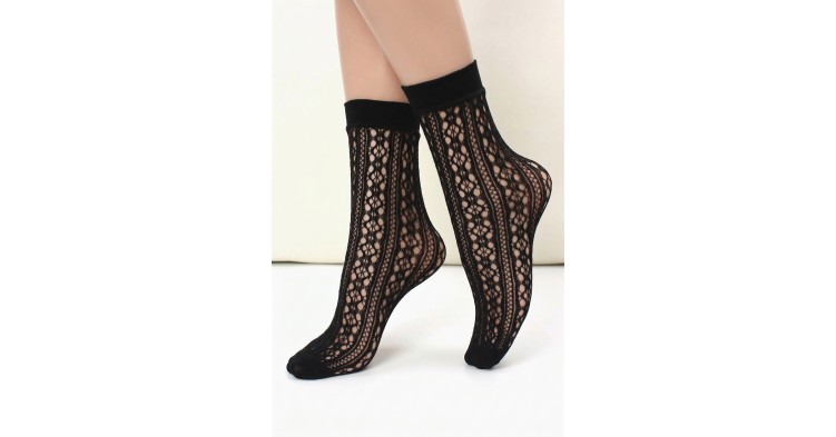 Элегантные полупрозрачные носочки выше щиколотки с выразительным ажурным рисунком в вертикальные дорожки. Лёгкие, эластичные и дышащие — подчёркивают щиколотку и добавляют образу акцент. Носите с платьями, юбками и укороченными брюками. Чёрный ажур эффектно смотрится с контрастной светлой обувью и денимом, добавляя образу легкости и графичности.