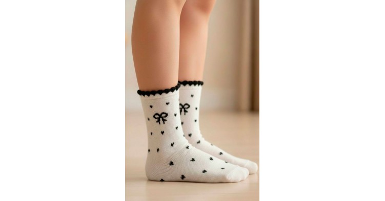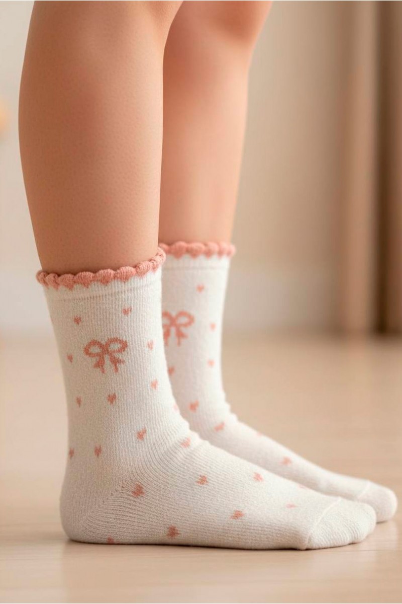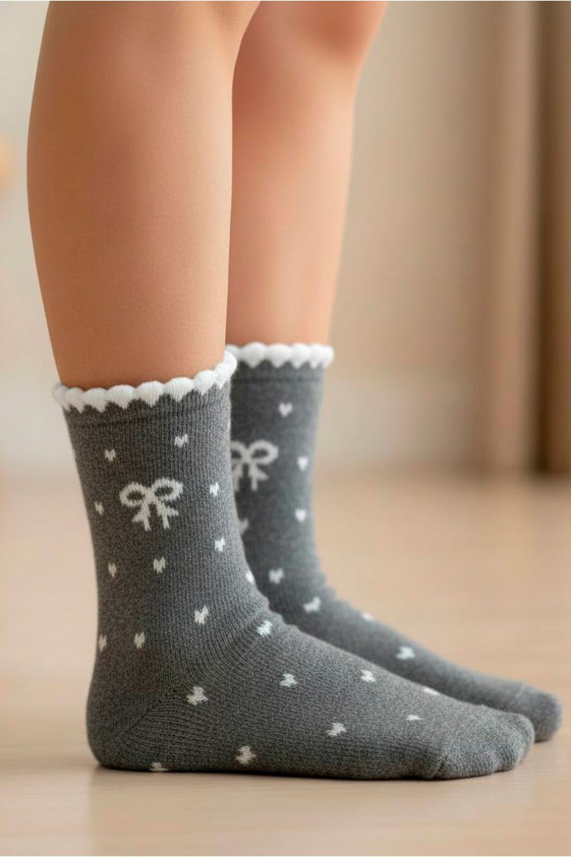 Мягкие носки с аккуратным бантиком сбоку и сердечками по всему периметру создают уютное и нежное настроение. Комфортная пряжа приятно ощущается на коже и отлично подходит для длительной носки. Вывязанная пятка обеспечивает удобную посадку и комфорт при движении. Эти носки станут прекрасным подарком и идеальным выбором для тёплых, уютных вечеров дома.
