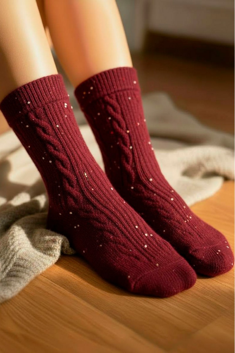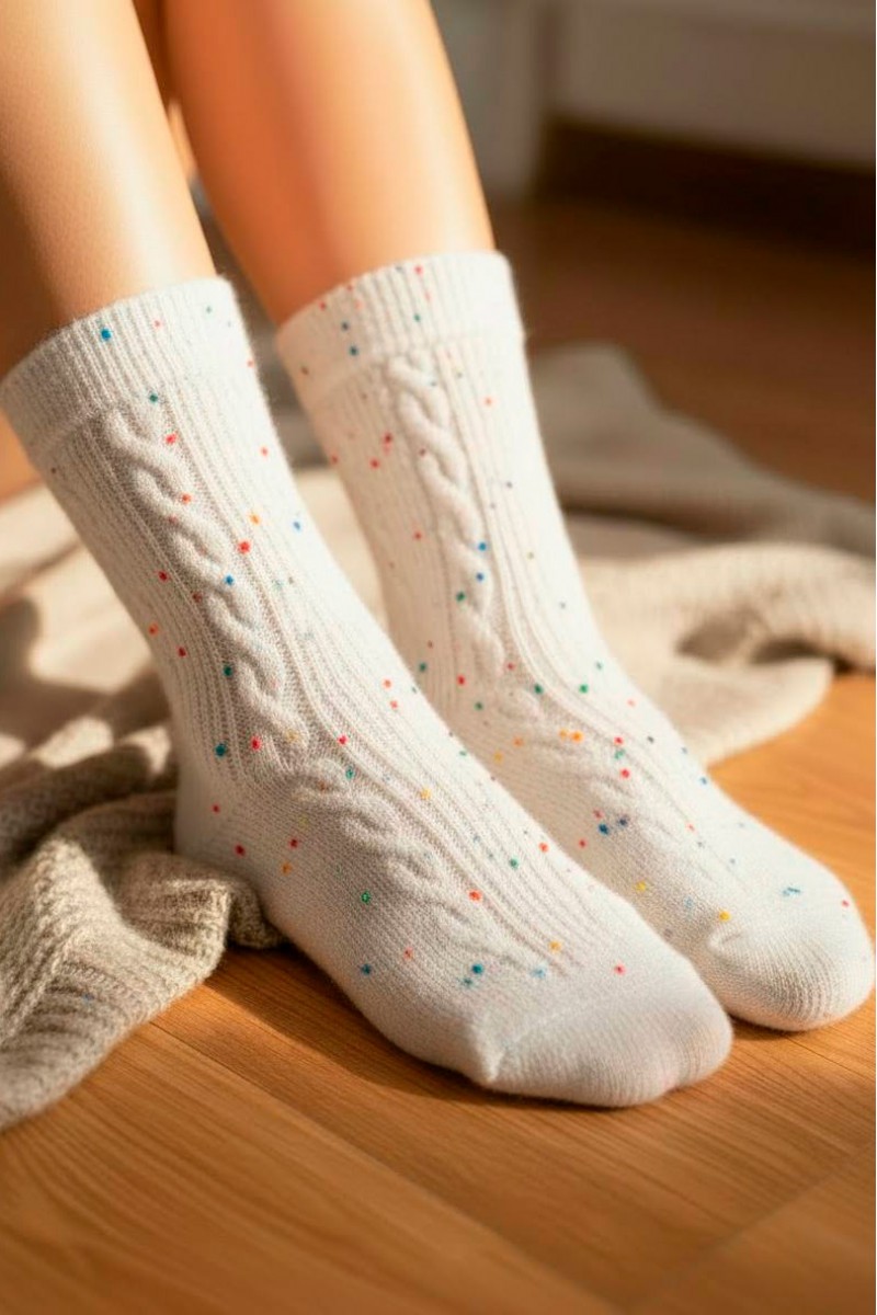 Очень тёплые женские носки с классическим узором «косы» подарят уют и комфорт в холодные дни. Аккуратно вывязанная пятка обеспечивает идеальную посадку, а мягкий материал бережно согревает стопы, делая носки незаменимым аксессуаром для дома и зимних прогулок.
