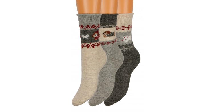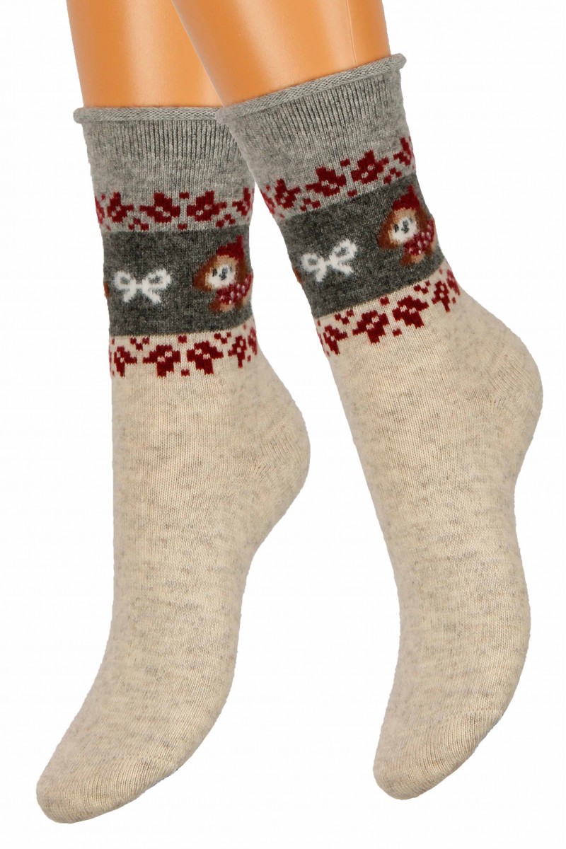 Женские носки с рисунком животных и красивым узором выглядят мягкими и по-настоящему зимними. Они создают ощущение уюта и тепла в холодное время года. Материал приятен к телу и хорошо сохраняет тепло. Носки эластичные и комфортно сидят на ноге.