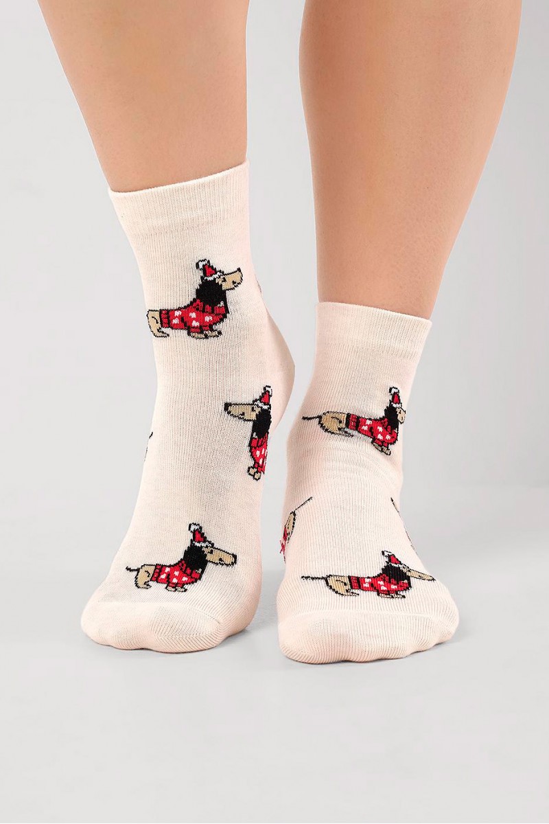Женские носки с рисунком такс в новогодних костюмах. Мягкий хлопок, входящий в состав изделия, обладает высокой воздухопроницаемостью, впитывает влагу и подходит для чувствительной кожи. Добавление эластана увеличивает износостойкость и прочность. Удобные носки дополнены анатомической резинкой, которая создает эффект распределенного давления и минимизирует проявления усталости. Мягкие носки прекрасно подходят для повседневного использования, занятий спортом и активного отдыха.