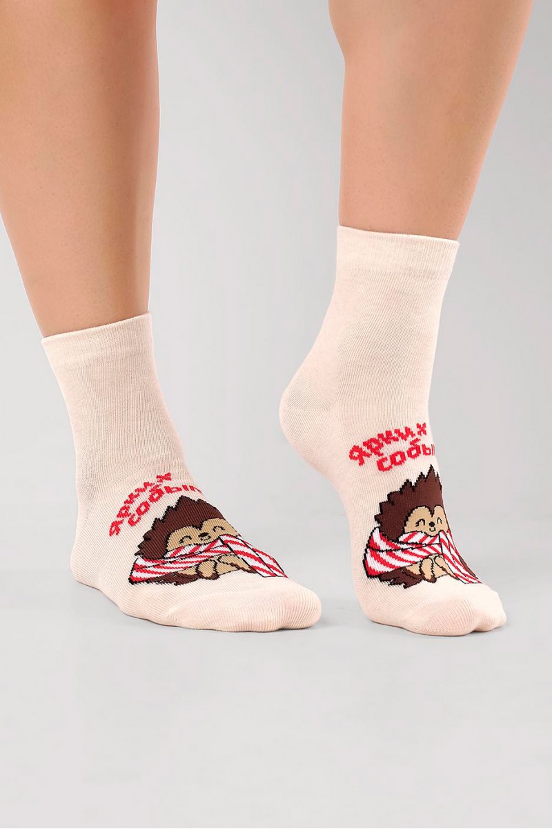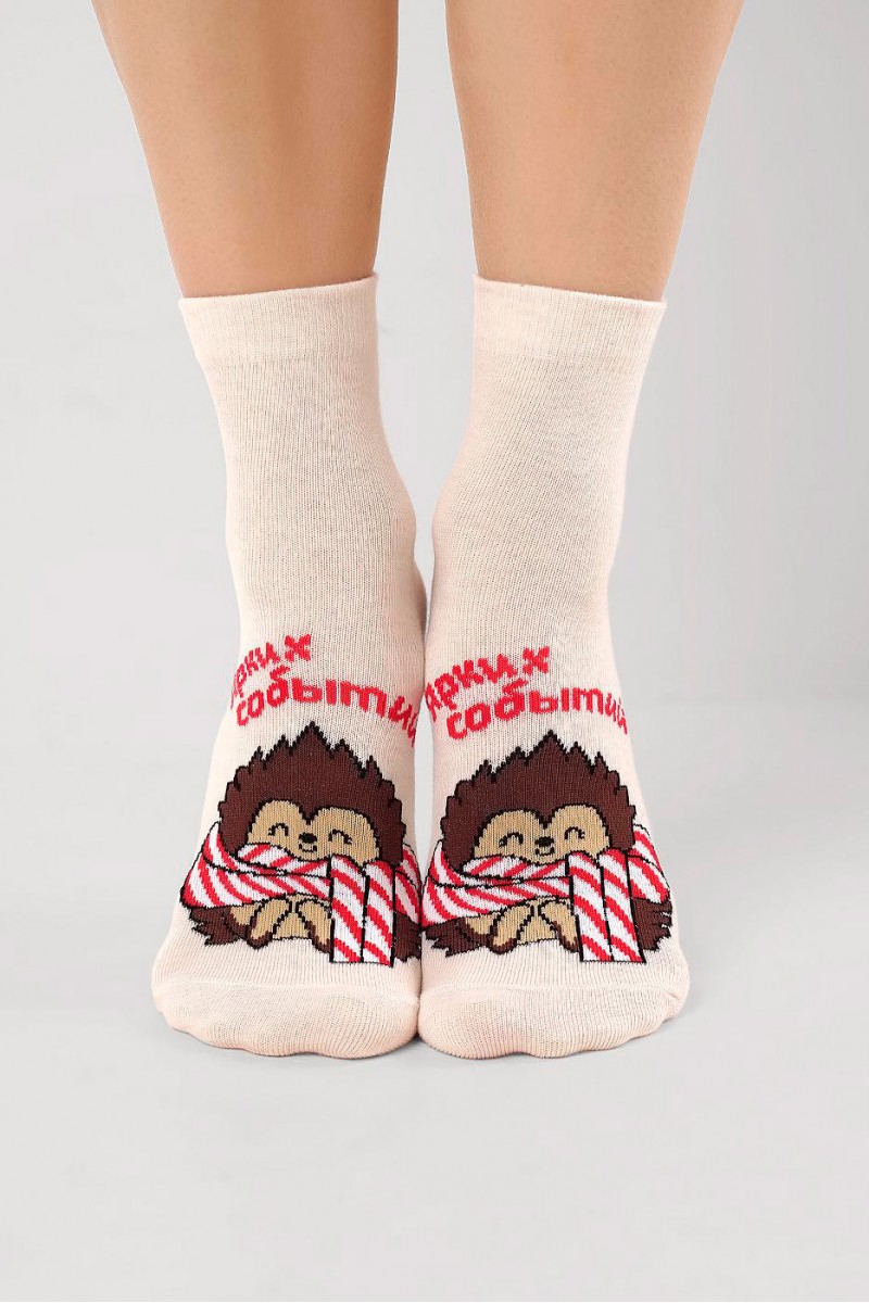 Женские носки с рисунком "Ёжик в красочном шарфике" и надписью "Ярких событий!". Мягкий хлопок, входящий в состав изделия, обладает высокой воздухопроницаемостью, впитывает влагу и подходит для чувствительной кожи. Добавление эластана увеличивает износостойкость и прочность. Удобные носки дополнены анатомической резинкой, которая создает эффект распределенного давления и минимизирует проявления усталости. Мягкие носки прекрасно подходят для повседневного использования, занятий спортом и активного отдыха.