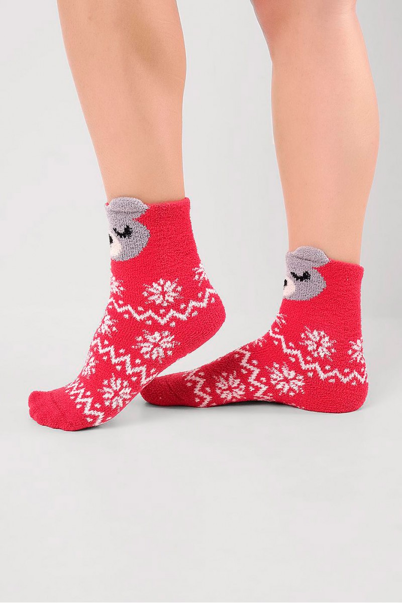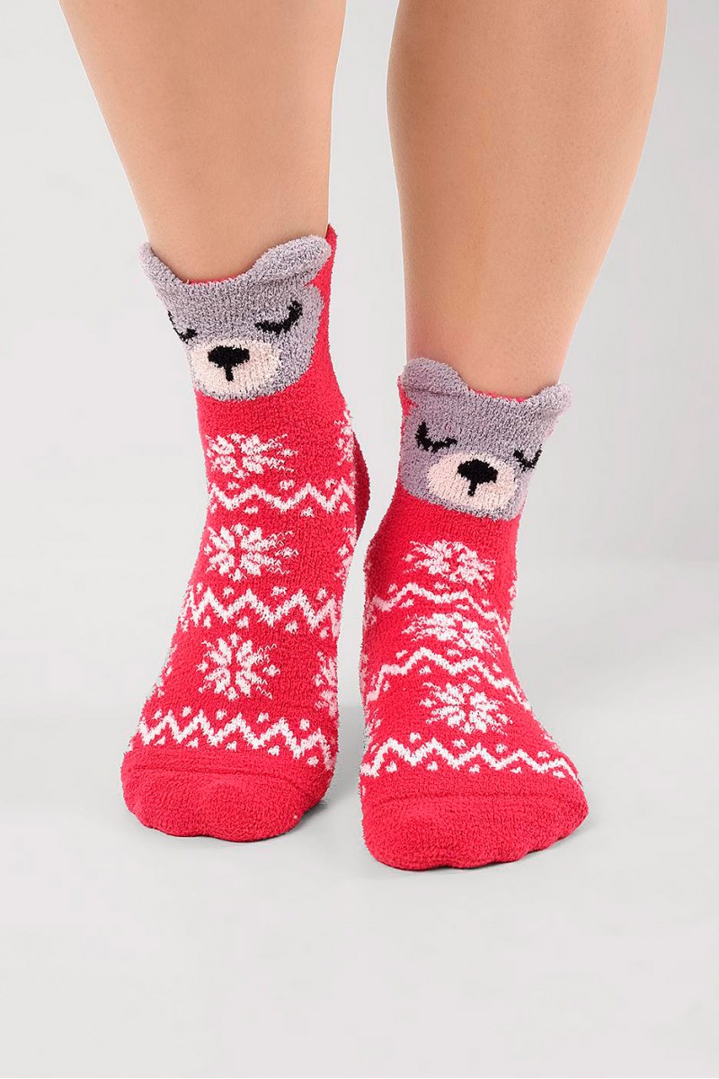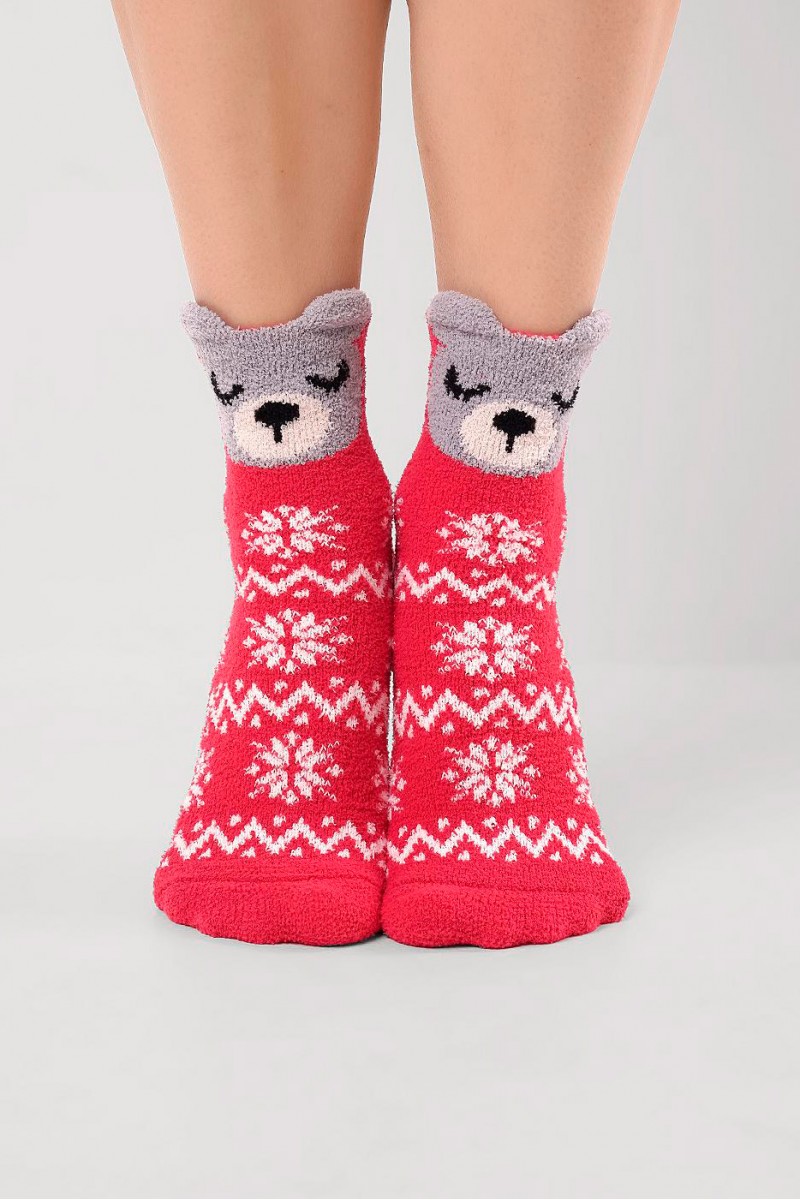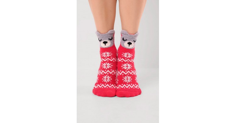 Женские носки из мягкой пряжи «травка» дарят ощущение тепла и уюта. Украшены милым рисунком медведя и объёмными 3D-ушками, придающими изделию игривый и оригинальный вид. Идеально подойдут для домашних вечеров и зимних праздников. Стильный аксессуар, который согреет и поднимет настроение.