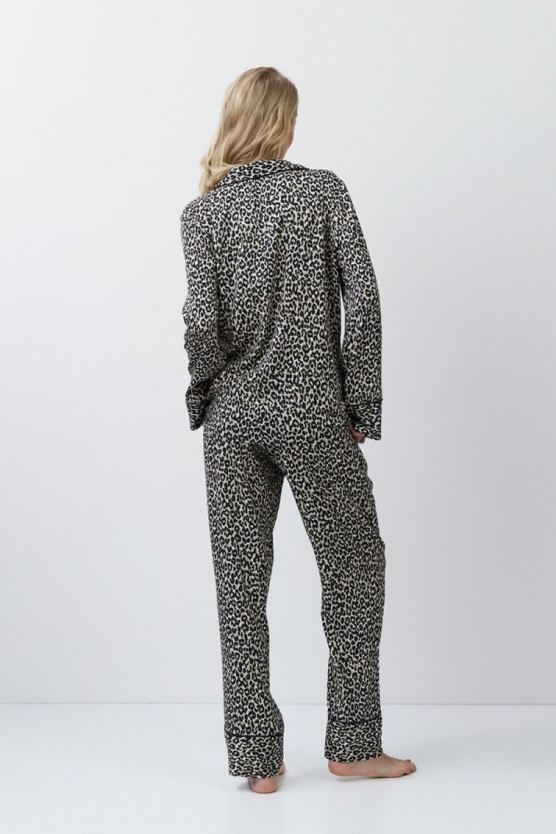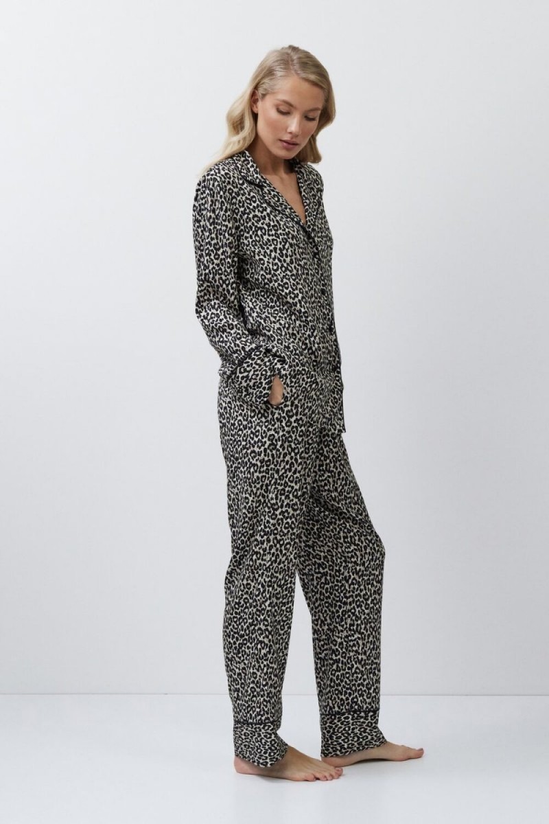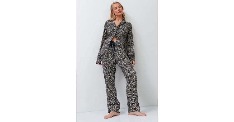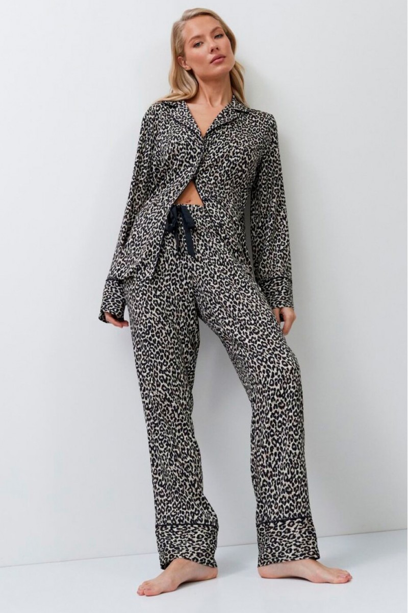 Женская пижама LEONA со штанами создана для вашего ночного комфорта и уюта. Мягкая вискоза с лёгким эластаном приятно ощущается на теле и обеспечивает свободу движений. Элегантный животный принт, рубашка на пуговицах с отложным воротником и окантовкой создают стильный образ. Свободные брюки с эластичным поясом, завязкой и карманами добавляют удобства во время отдыха и сна.