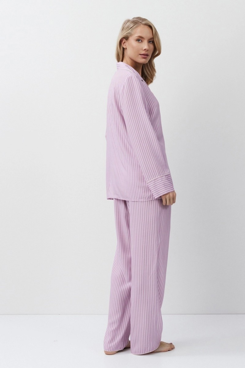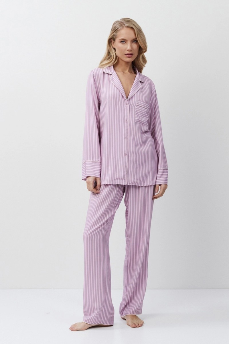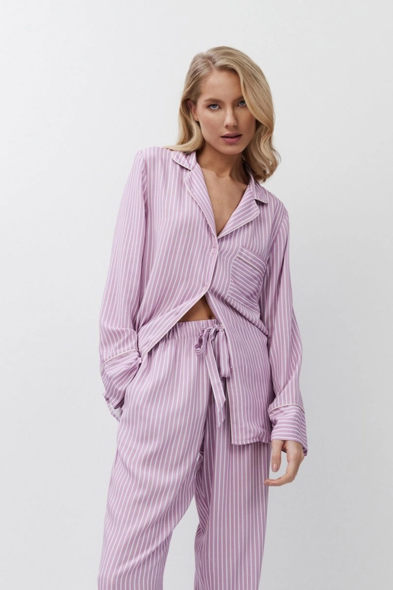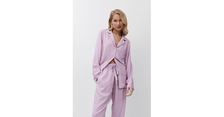 Пижама женская со штанами для вашего ночного комфорта. Пижама выполнена из вискозы. Рубашка на пуговицах, с длинными рукавами, отложным воротником и нагрудным карманом. Окантовка дополняет и украшает комплект. Штаны длинные, прямые, с эластичным поясом с завязкой. Расслабьтесь с максимальным комфортом и стилем в пижаме MARGARETH.