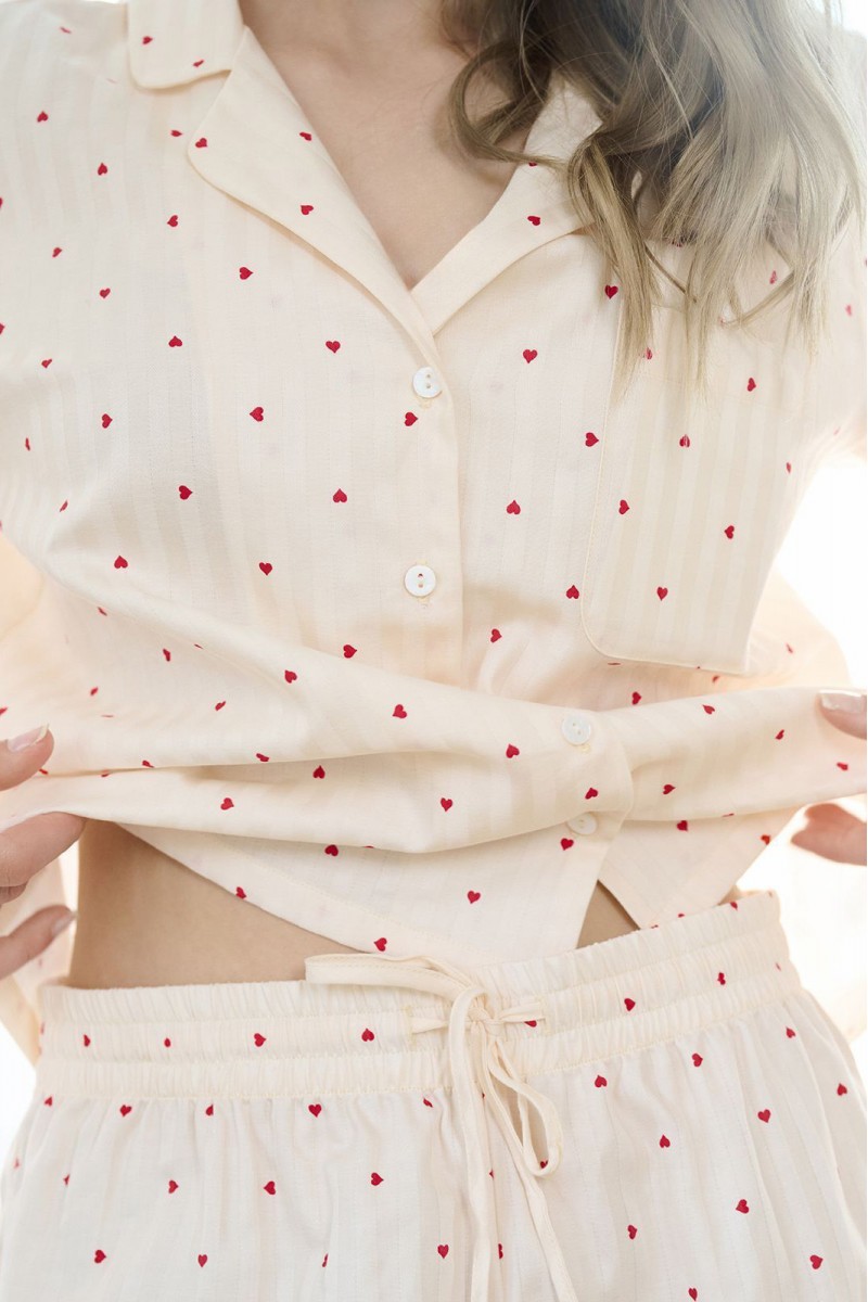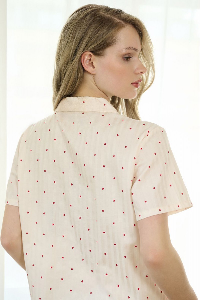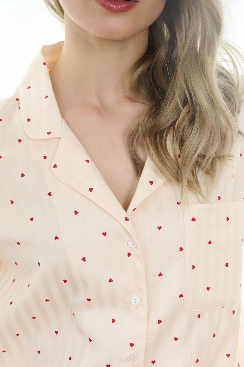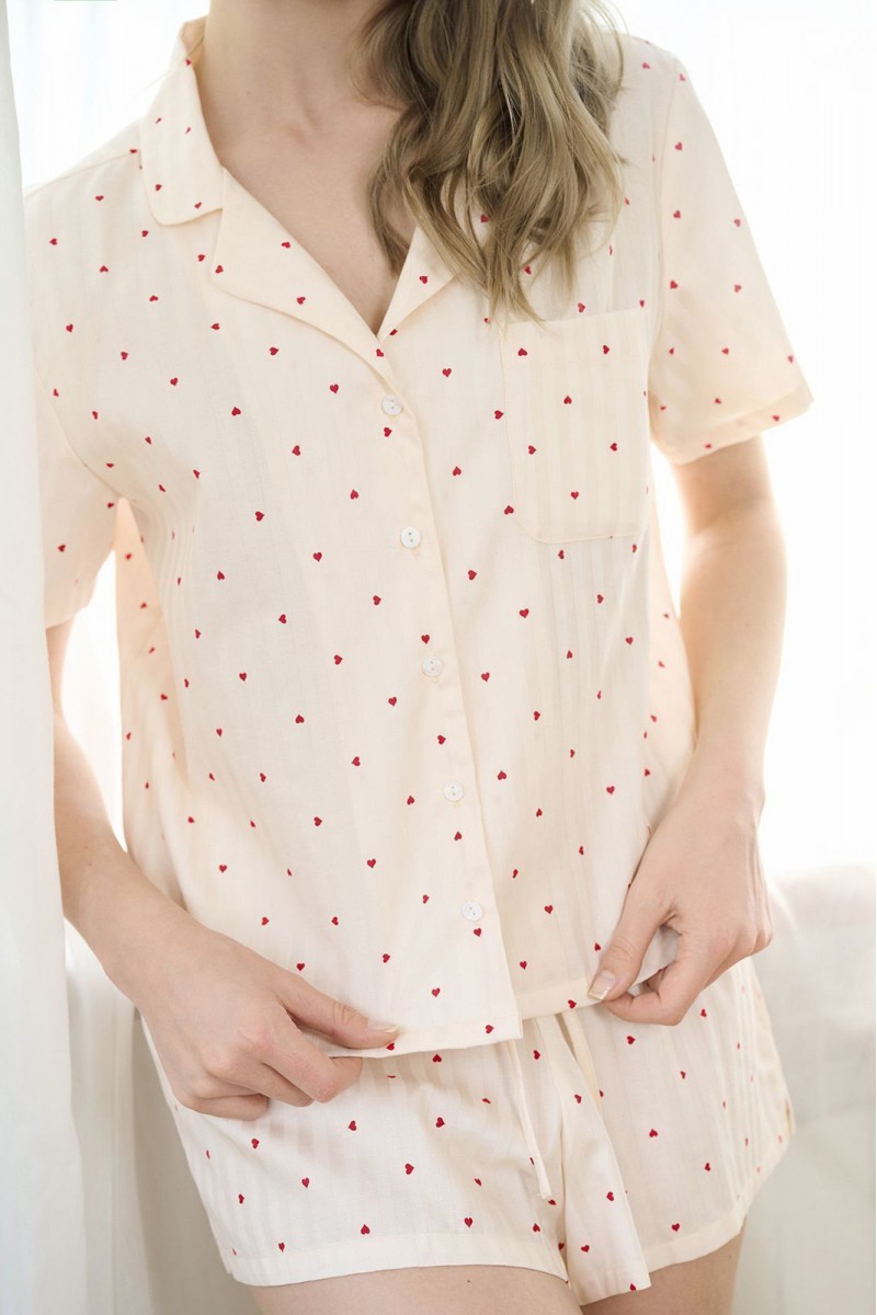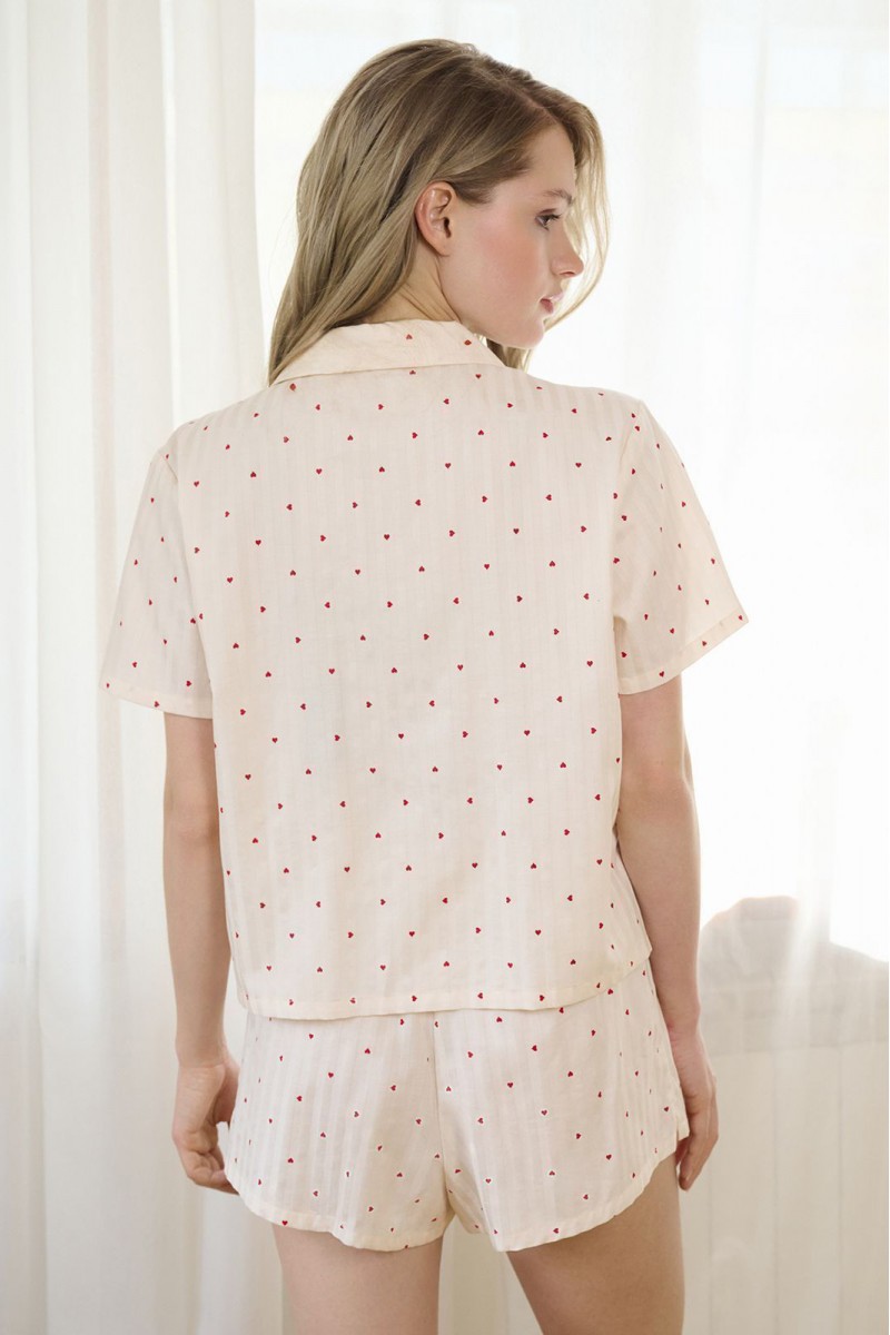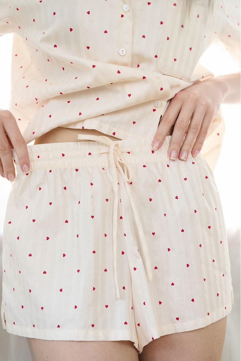 Женская пижама обеспечивает комфорт и приятное ощущение во время отдыха. Этот комплект состоит из стильной рубашки и мягких шортов. Выполнена в нежно-розовом цвете с мелким принтом из красных сердечек, создавая романтичную и уютную атмосферу. Рубашка на пуговицах с короткими рукавами, отложным воротником и накладным карманом на груди — идеально подойдет для домашнего отдыха. Шорты с мягкой эластичной резинкой и внутренним шнурком для регулировки посадки обеспечат комфорт и индивидуальную посадку. Идеальный вариант для спокойных и приятных вечеров дома.