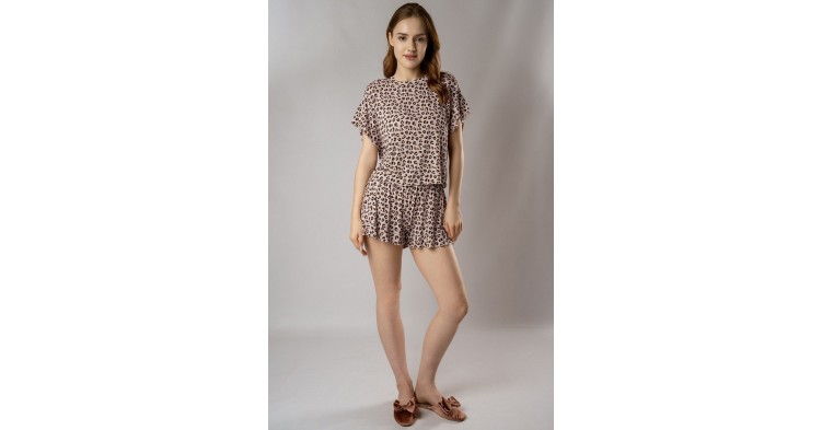 Пижама из нежной вискозы с фактурой в рубчик окутывает вас, как облако — настолько легкой и приятной кажется ткань. Футболка с выразительными плечами подчеркивает силуэт, а шорты идеально сидят на талии, даря полную свободу движений. Приглушенный леопардовый принт добавляет изюминку, не перегружая образ.