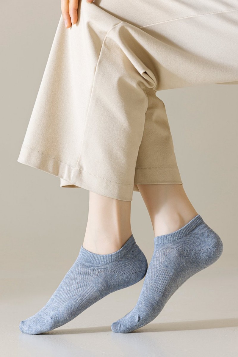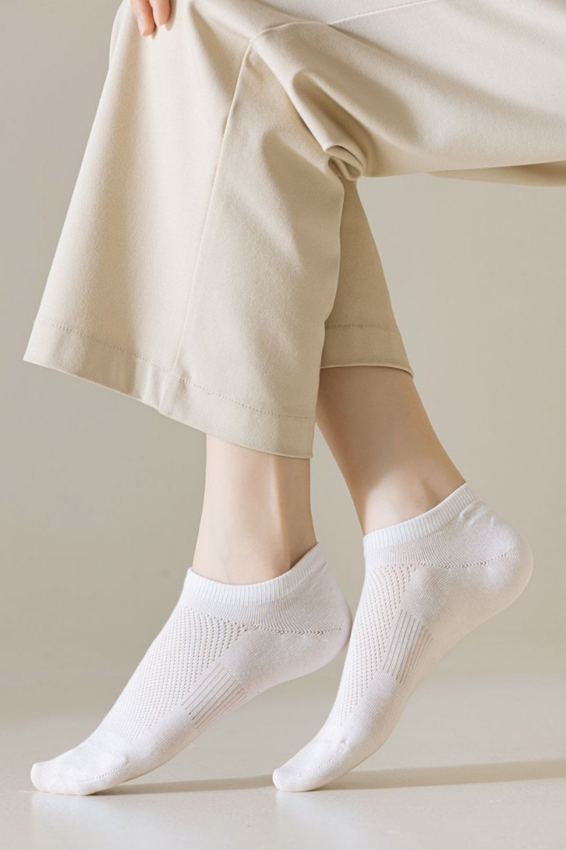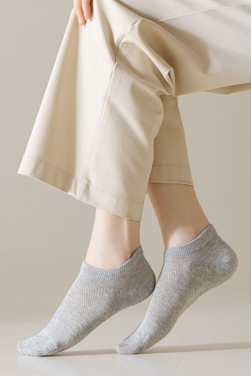 Женские закрытые подследники с перфорацией из мягкого хлопкового трикотажа. Силикон со внутренней стороны на пяточке предотвращает соскальзывание. Прочные нити полиамида и эластана в составе ткани делают её износостойкой. Модель подойдет на лето и для межсезонья. Высота идеальна для кроссовок и ботинок. Такие укороченные носочки исключают натирание кожи при контакте с обувью, при этом незаметны под ней.