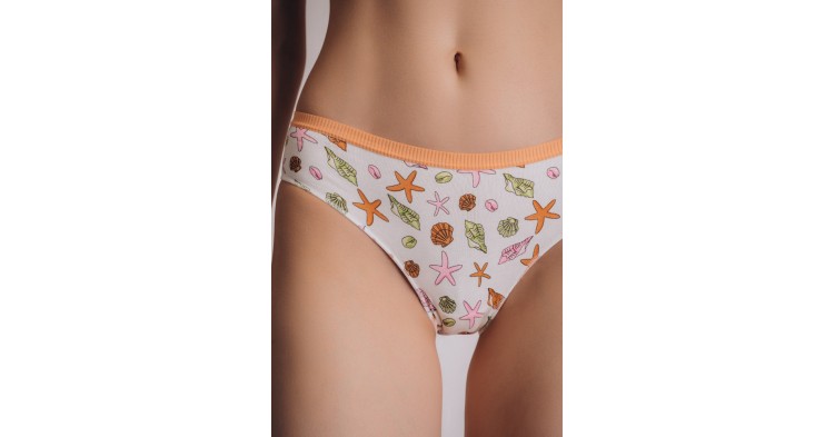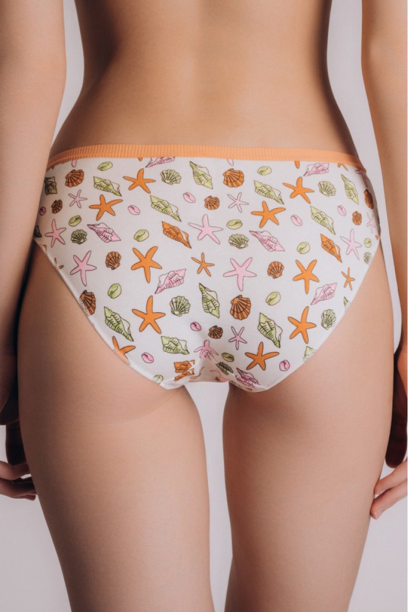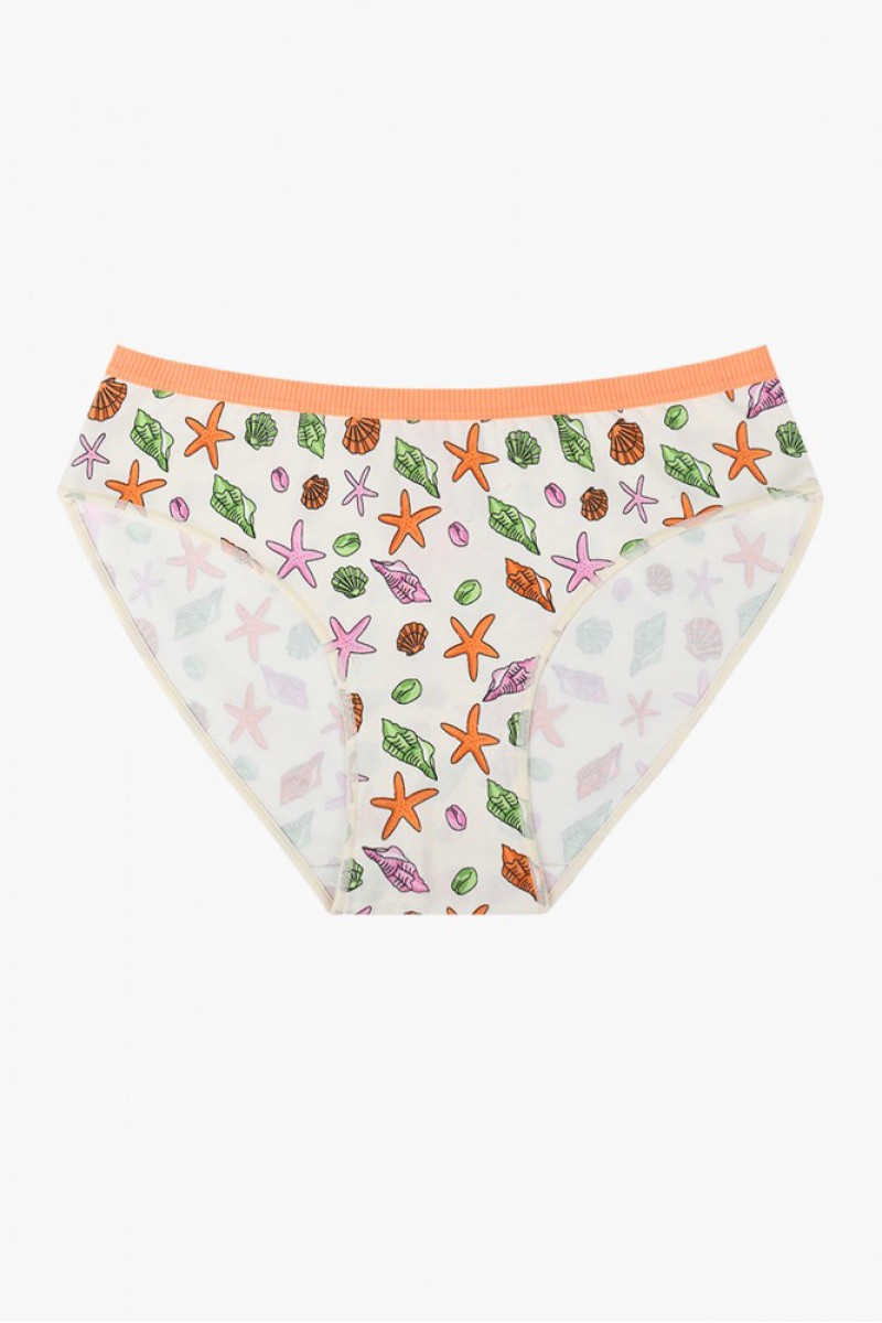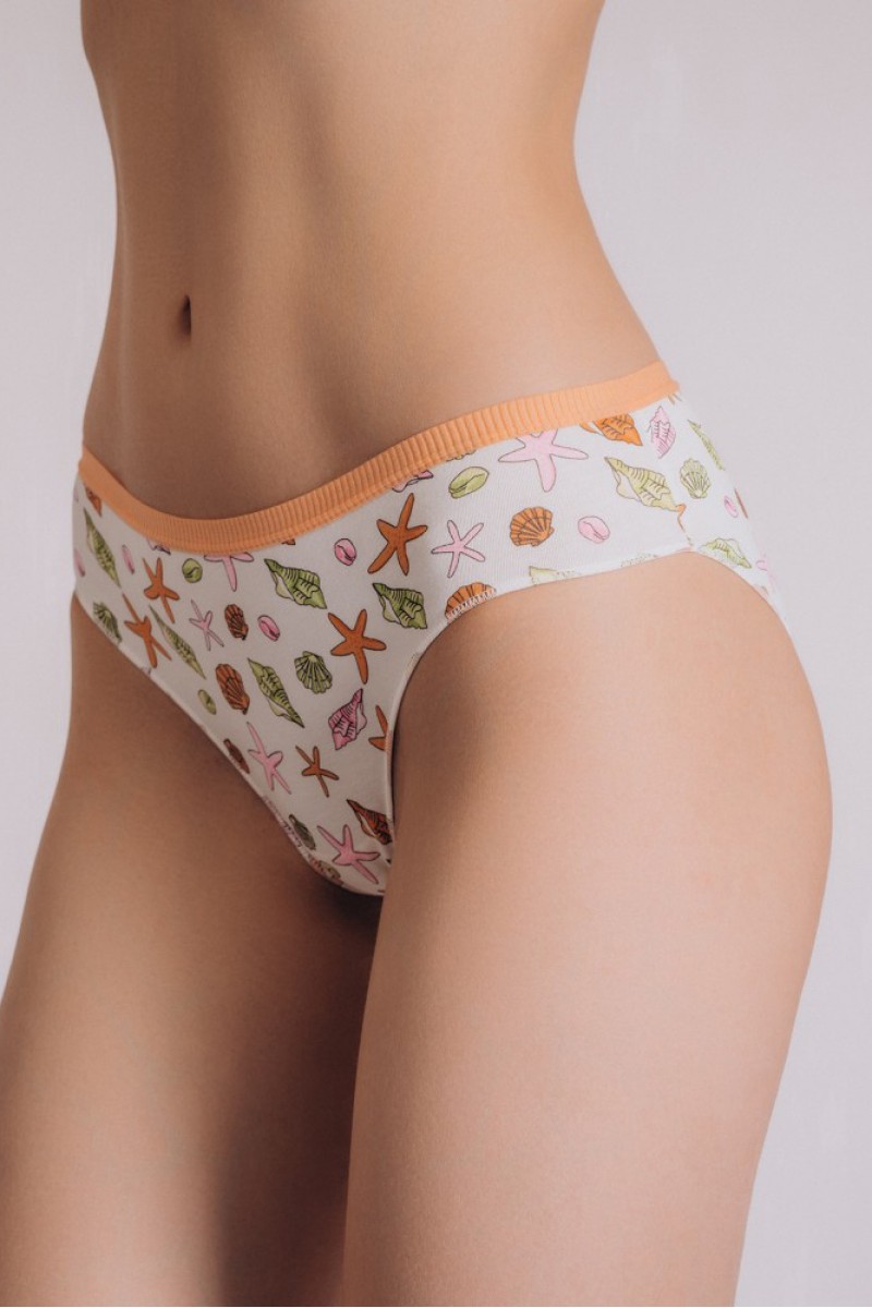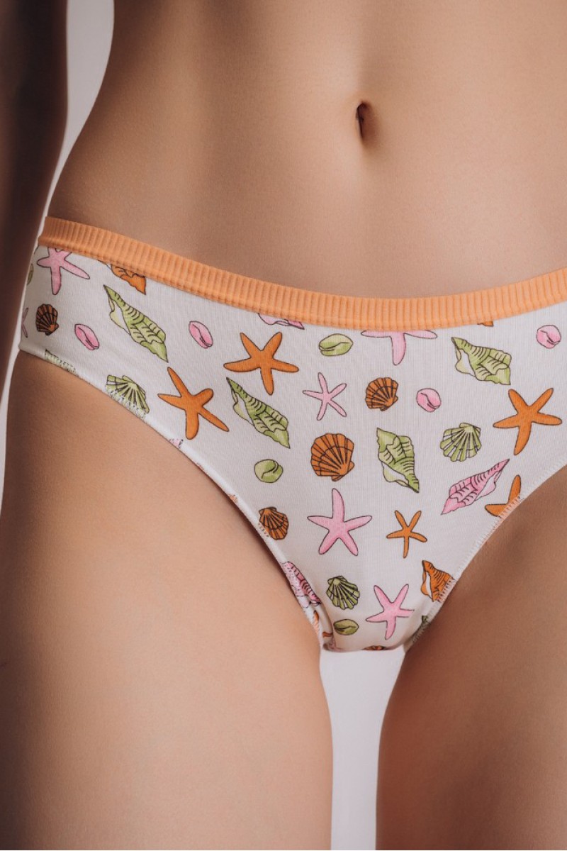 Женские слипы выполнены из хлопка с добавлением эластана, что обеспечивает хорошую эластичность и комфорт. Модель выполнена в чистом белом цвете с красивым принтом, изображающим морские ракушки, звёздочки и кораллы в нежных летних оттенках — оранжевом, розовом и мятном. Трусы средней посадки держатся на талии мягкой эластичной резинкой персикового цвета, а внутри оснащены хлопковой ластовицей для дополнительного комфорта. Стильный и уютный дизайн делает эти трусы отличным выбором для повседневного ношения.