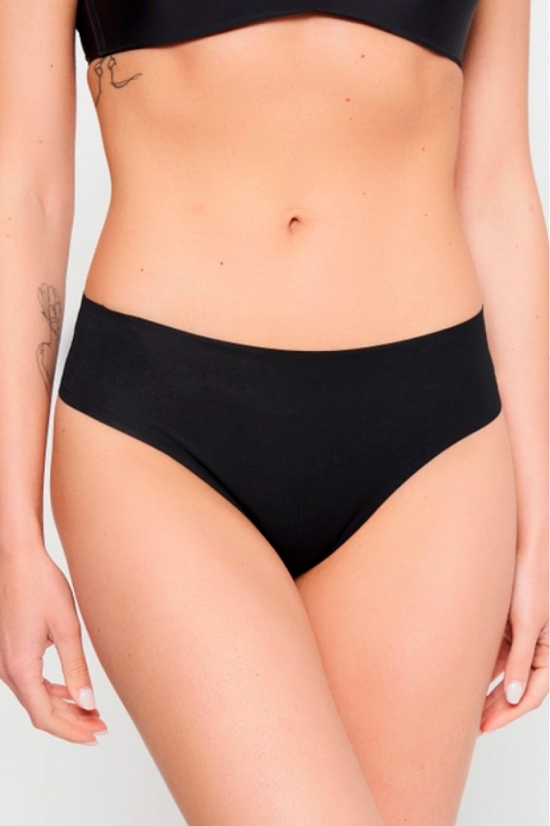 Трусики слип со средней линией талии и лазерной обработкой края. Модель выполнена из хлопка и полиамида с добавлением эластана, превосходно тянется и сидит на фигуре. Передняя деталь трусиков гладкая, бесшовная. Задняя с овальным широким тканевым поясом, ниже которого изысканное эластичное кружево с цветочным узором и швом по середине. Высота боковин средняя. Удобная посадка.