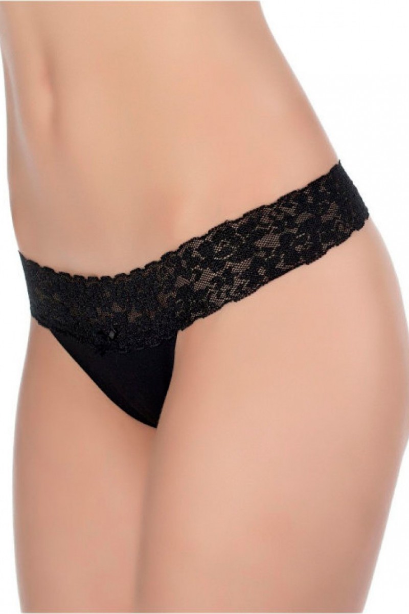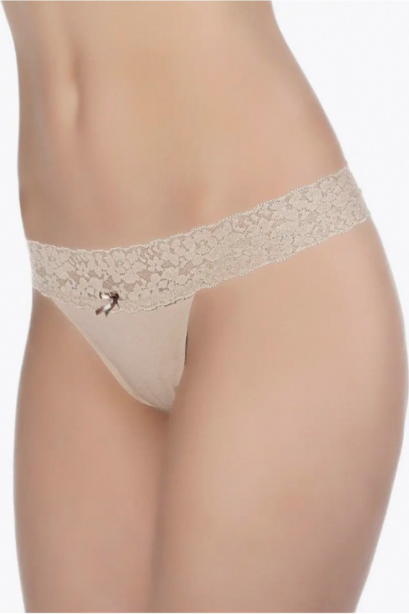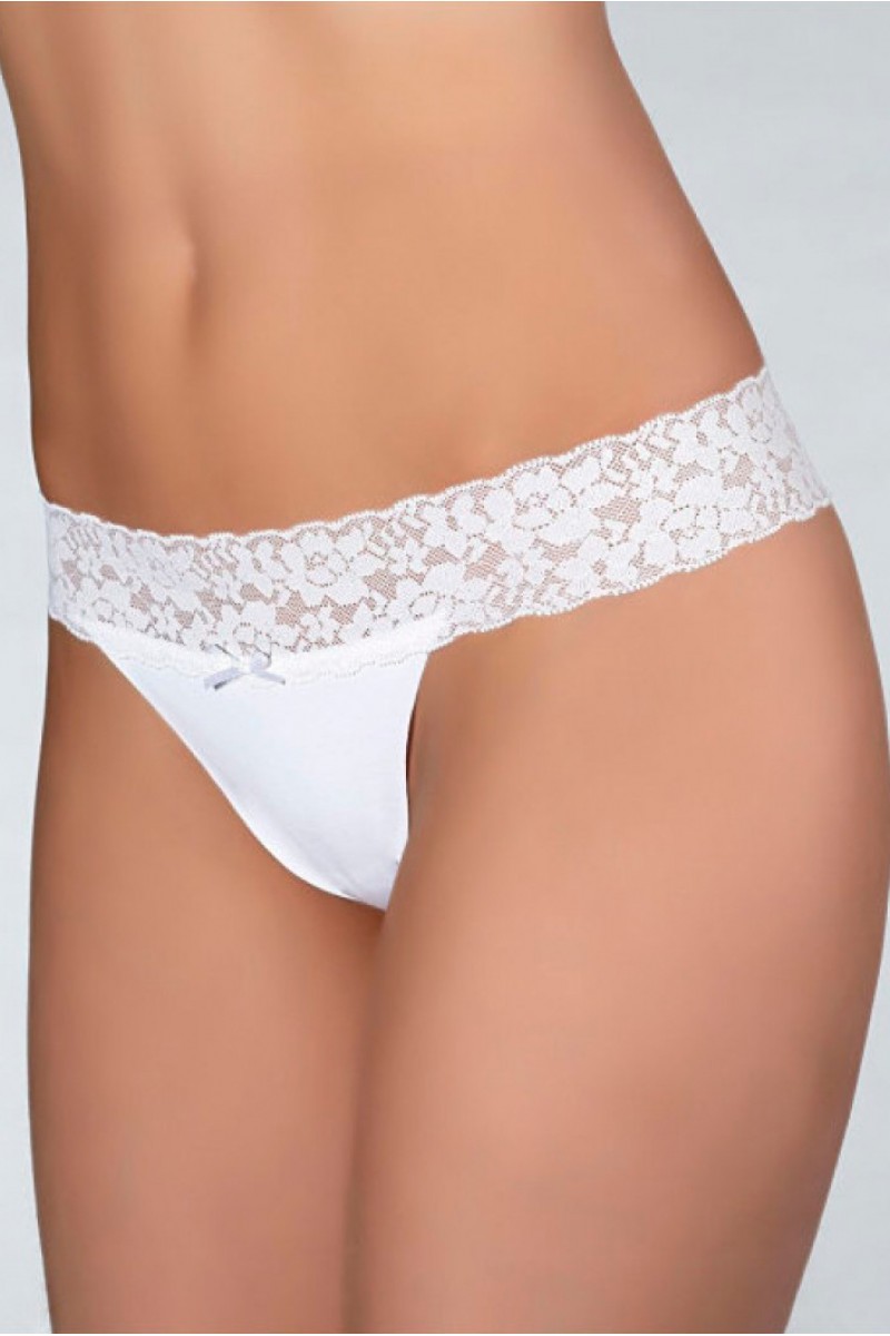 Стринги из хлопка с добавлением эластана отличаются мягкостью, эластичностью и комфортной посадкой. Модель с заниженной талией оформлена широкой кружевной резинкой на поясе, украшенной изящной аппликацией в виде банта спереди. Края обработаны по лазерной технологии, что делает бельё незаметным под одеждой и максимально удобным в носке. Идеальное сочетание практичности, стиля и нежного декора.
